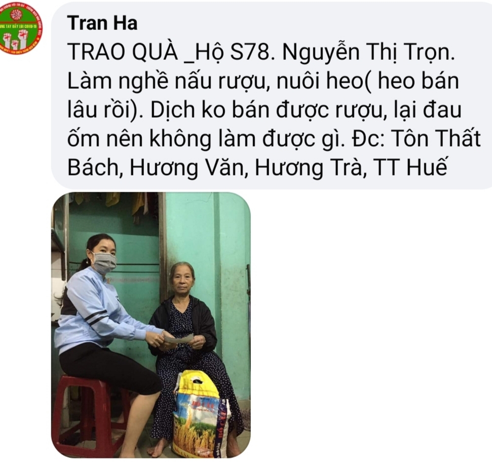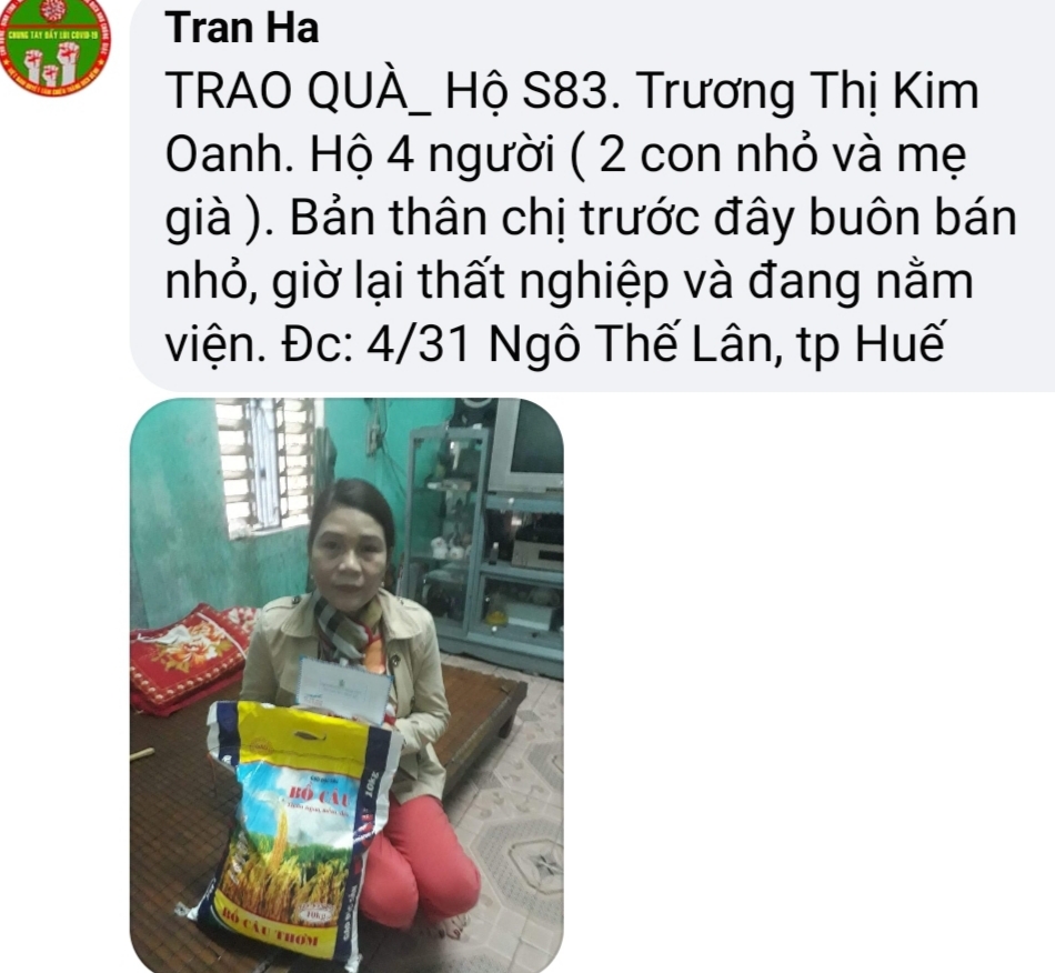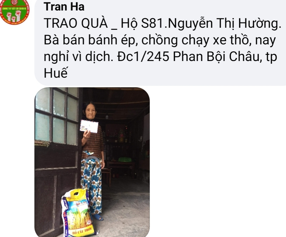 Tuy nhiên, đến nay thì các hoàn cảnh gia đình neo đơn, khó khăn, bán vé số, ve chai, buôn bán rong, làm thuê, làm mướn, ...., bị mất nguồn thu nhập do Covid _19 vẫn được các TNV NTCM Huế cập nhật. Và đã vượt qua con số 100 hộ dự kiến ban đầu.