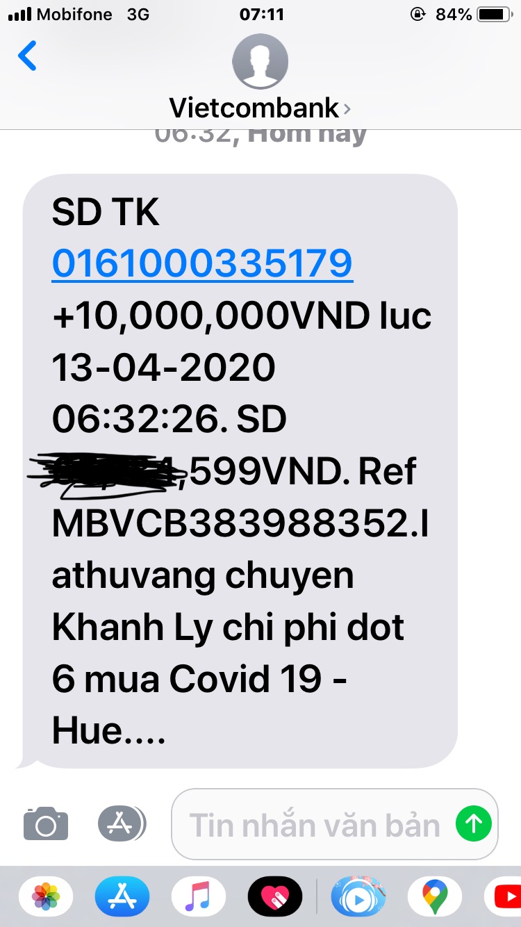 Lathuvang tiếp tục chuyển 20,000,000 đ tiền tạm ứng lần thứ 7 để các bạn khu vực Huế thực hiện việc giúp đỡ bà con nghèo khó bị ảnh hưởng bởi dịch bệnh COVID 19 dùm nhé.