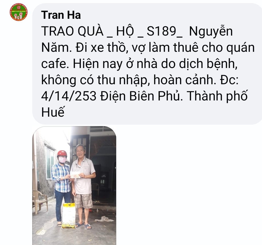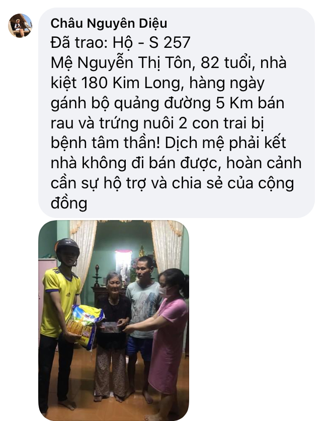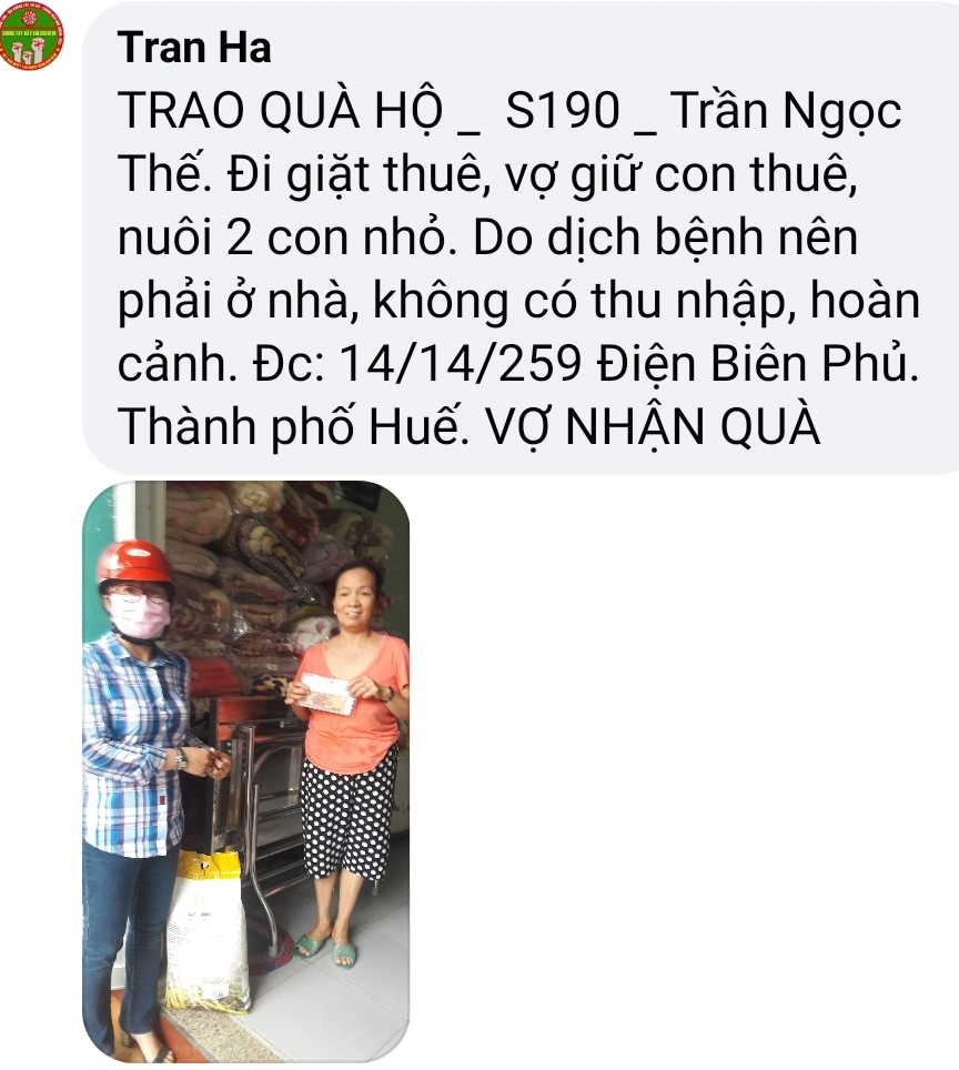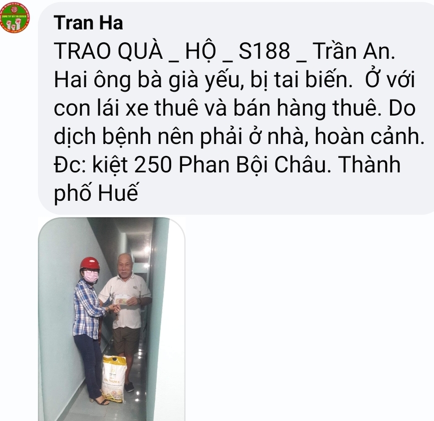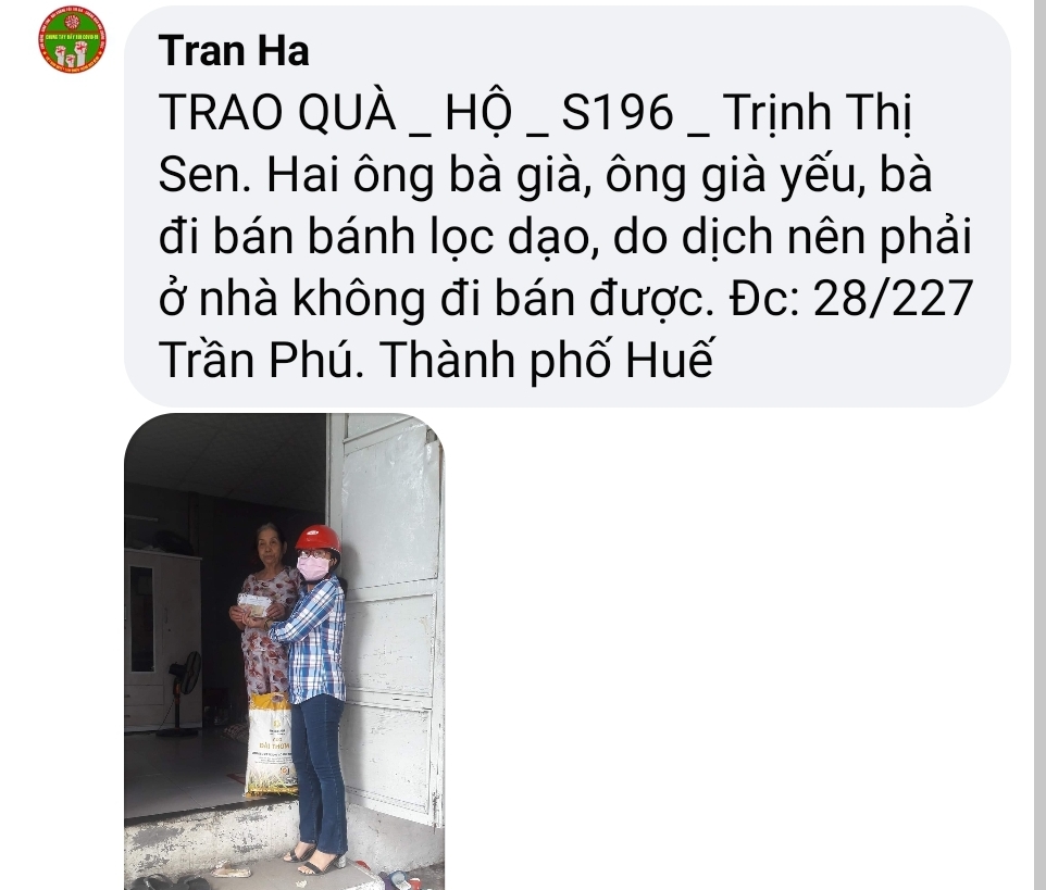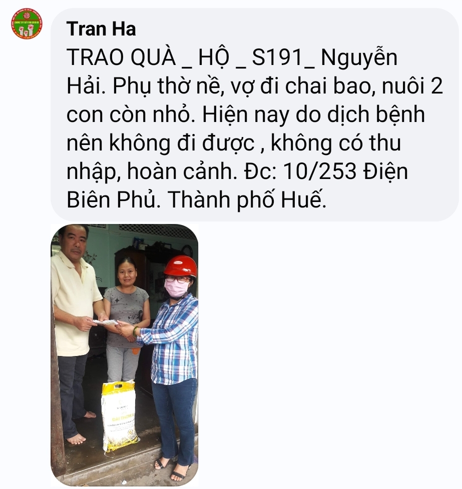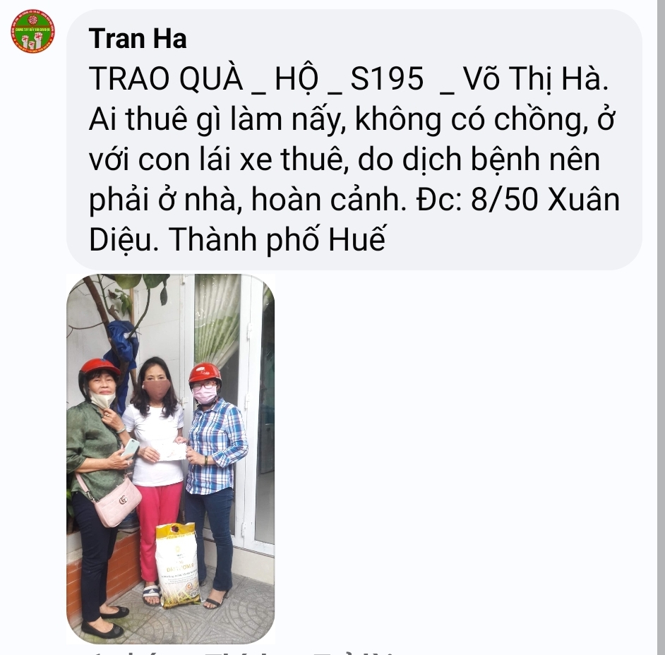 Thật lòng các bạn tnv NTCM HUẾ có người còn độc thân, có người có gia đình con nhỏ, lúc đại dịch đang hoành hành cả nước buộc giãn cách xã hội, ai cũng sợ bệnh - sợ đau - sợ chết, lúc tham gia hương trình ai cũng bị gia đình phản đối vì khi xác minh, trao quà nguy cơ mắc bệnh rất cao, nhưng một lòng muốn chung tay chia sẻ góp chút công mọn làm nên 1 chương trình nhân văn nên Mọi sự cản ngăn điều được hoá giải bằng những công việc cụ thể giúp người!