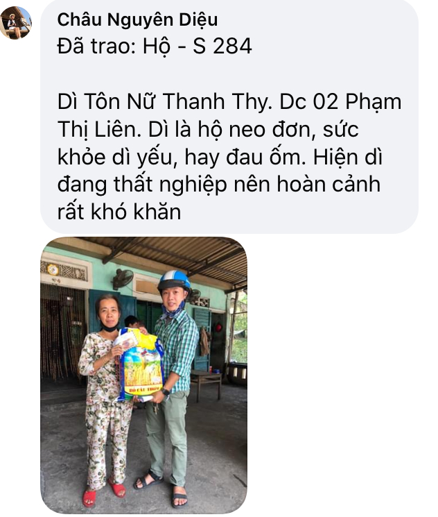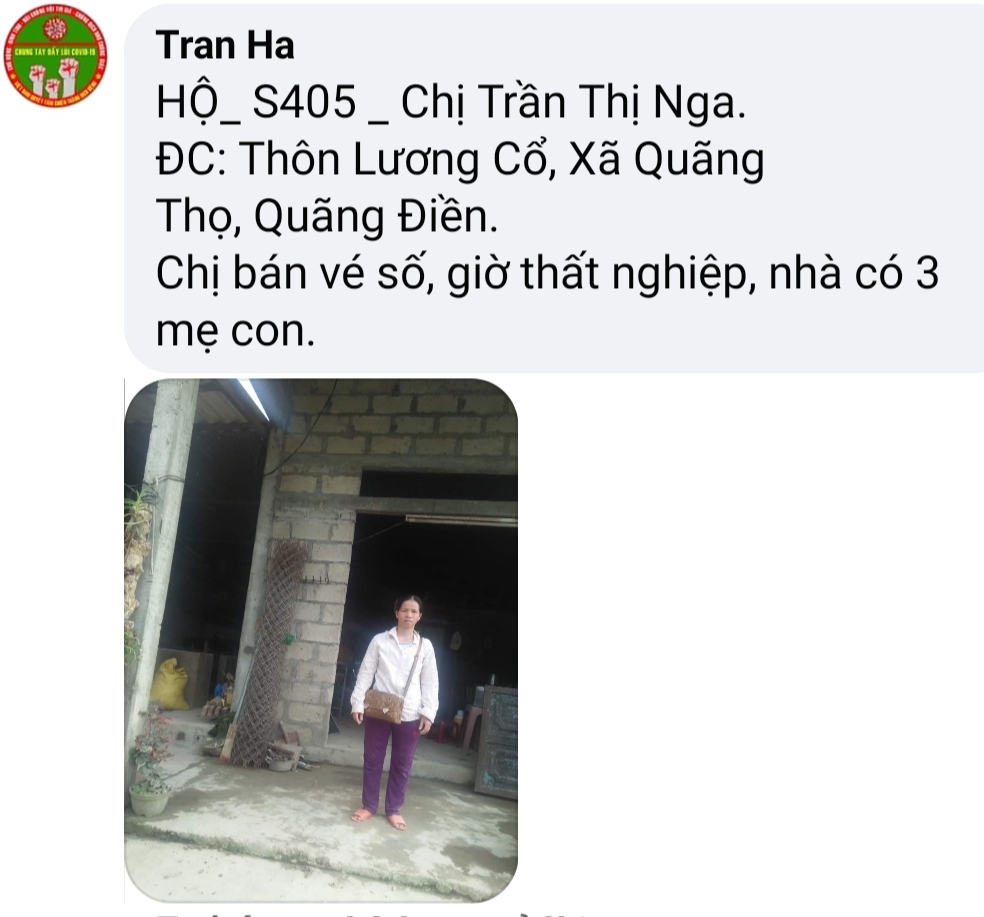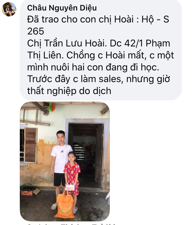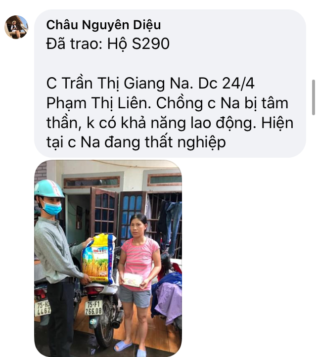Sáng nay nhóm các bạn Huế đã chạy xuyên trưa để kịp gửi đến 50 suất quà NTCM hỗ trợ kịp cho bà con, lúc nhóm đến trao quà có mấy cháu nhỏ đang ngồi lặc rau lang trước nhà là hò reo gọi ba mẹ ông bà ra đón nhìn con nít ngây thơ, yêu quý mình như vậy bọn e rất vui, hỏi ra mới biết lý do các bé vui vì các bé còn nhớ các anh chị hôm đến thăm nhà, xác minh hoàn cảnh để xin hổ trợ gạo và tiền mua thịt cá cho bé, có bé út hỏi: ‘ chị chị...khi ‘mô ‘là bọn e được có hỗ trợ mua cá’ thì các thành viên im lặng chỉ dám trả lời là ‘chị không dám hứa nhưng mong là sẽ sớm thôi em’ nà” con nít nghe xong ghi nhớ và chờ đợi, ngay khi thấy mấy anh chị đến lại là bé sung sướng vì anh chị đã giữ lời hứa quay lại và mang theo món quà của lòng nhân ái đến với các em! Nhận gạo và 200k tiền mặt xong bé lớn chạy ù đi chợ mua thịt cho mấy đứa em kịp cơm, người mẹ thì khui bao gạo nấu liền kịp cơm trưa, bọn trẻ thì được nụ cười sung sướng , còn tiễn mấy anh chị ra Tân ngõ hihi!!!