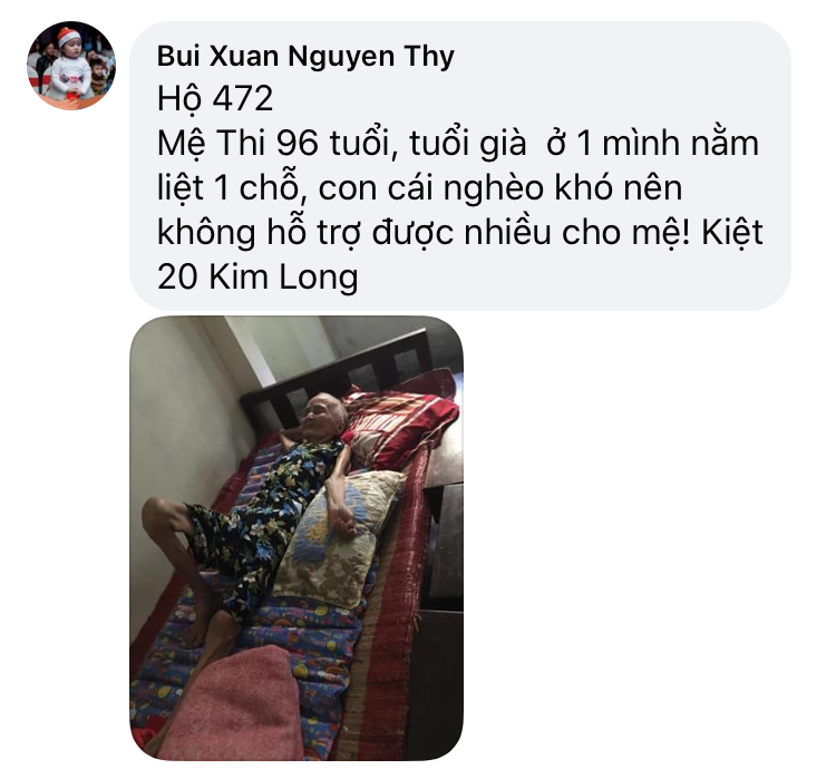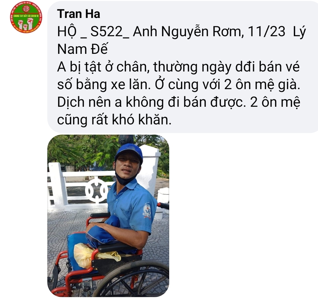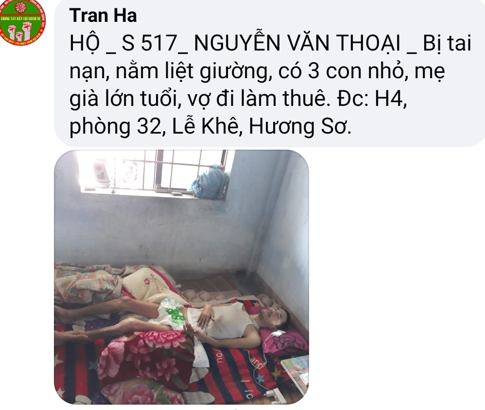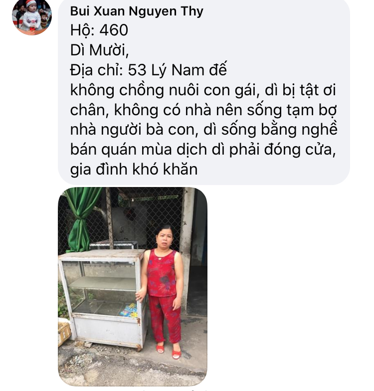 Có một hoàn cảnh, mấy năm nay điều đặn ra nhận cháo về ăn, Chờ phát cho bệnh nhận xong mới nhận. Còn nhiều lấy nhiều còn ít lấy ít. Rất hiền và tội; mình không biết chú ở đâu, tình trạng khổ. Nếu các bạn kết nối được thì quá tốt. Xin cảm ơn.