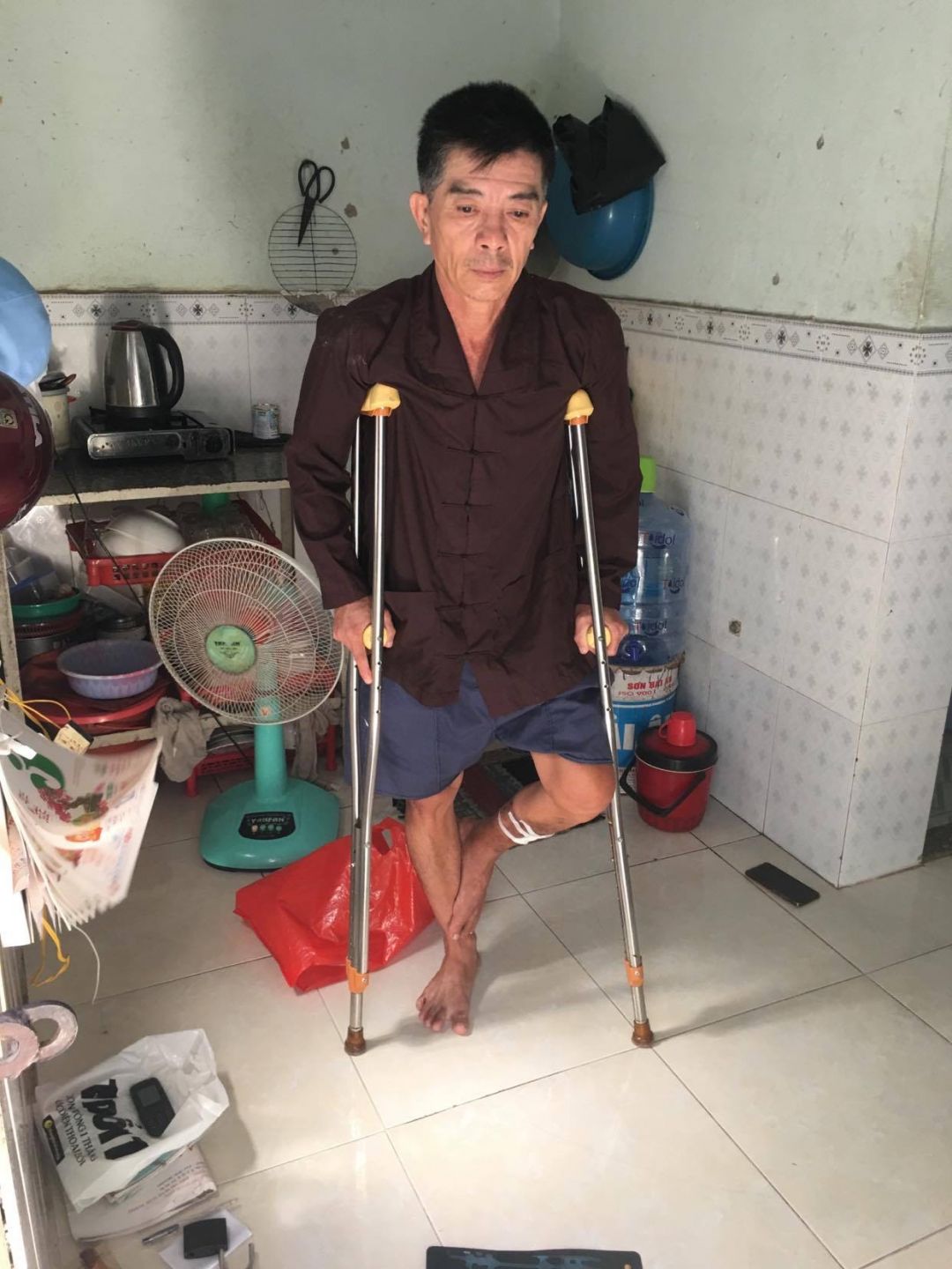Anh Nguyễn Văn Sáng, sinh năm 1965, gãy chân phải đi nạng, đã viết bài xin quà trên face book NTCM