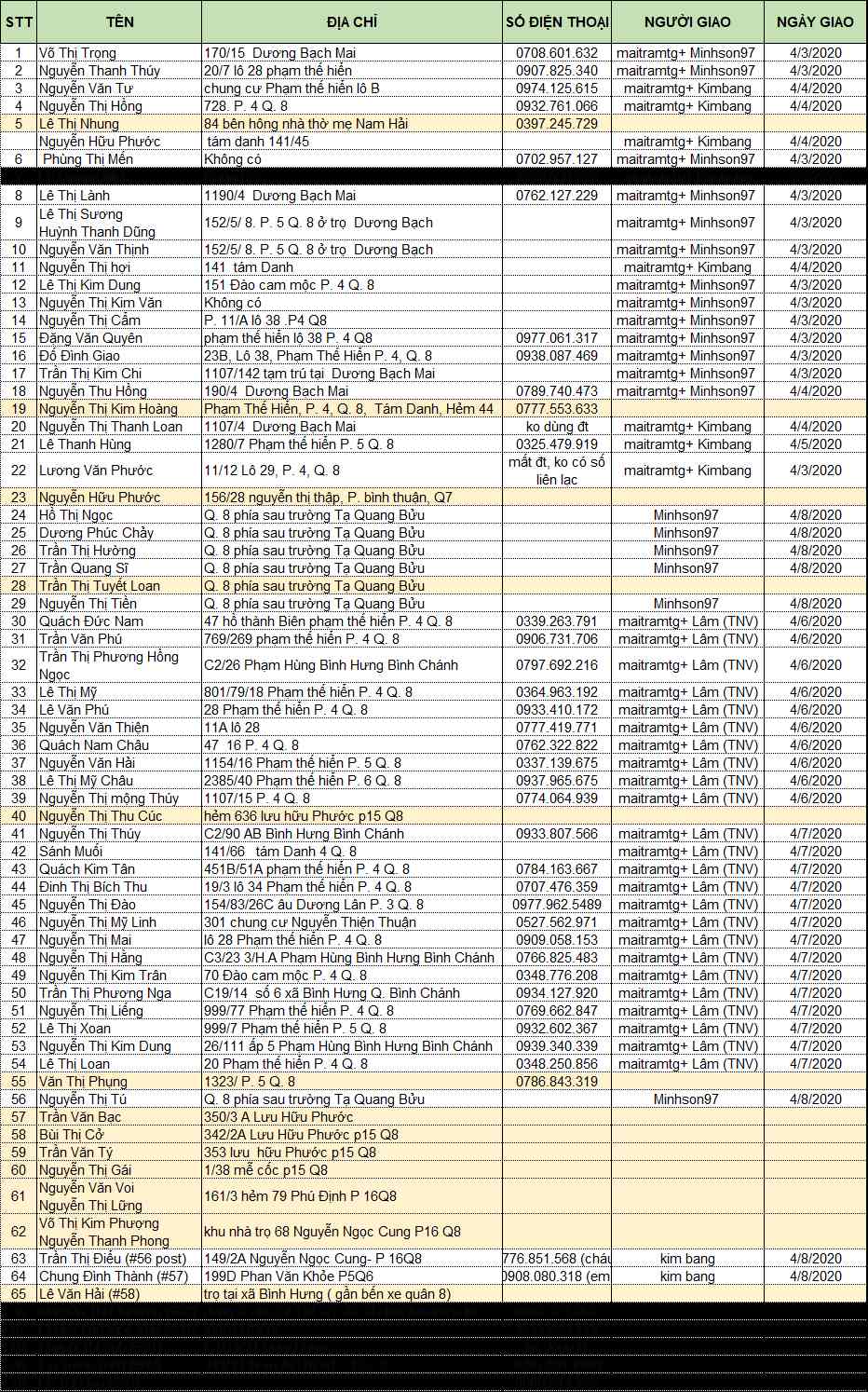 Để tiện việc theo dõi khi trao quà, Lộc có làm việc với TV Bảo Chi để tạo một danh sách thống kê tất cả các trường hợp.  Bảo Chi sẽ cập nhật bảng thống kê thường xuyên để giúp cả nhà theo dõi.  Các dòng màu trắng dành cho các trường hợp đã trao quà xong, các dòng màu vàng dành cho các trường hợp chưa trao quà.  Trong lúc thực hiện bảng thống kê này, Lộc có lưu ý một số trường hợp, có lẽ do số trường hợp quá nhiều trong một thời gian ngắn nên chúng ta có ghi lộn số thứ tự khi đăng bài cập nhật trao quà.  Mong cả nhà yên tâm,  Lộc và Bảo Chi sẽ cố gắng theo dõi để không bỏ sót các trường hợp thông qua bảng thống kê này; còn việc sửa lại số thứ tự trong các bài viết chúng ta sẽ thực hiện chậm lại một chút cũng được.  Quan trọng xin các thành viên phát quà lưu ý sử dụng số thứ tự và danh sách theo như liệt kê trên bảng thống kê để chúng ta không bỏ sót.  Nếu có sai sót gì với thông tin trên bảng thống kê, xin liên lạc Lộc và Bảo Chi để chỉnh sửa ngay nhé cả nhà.