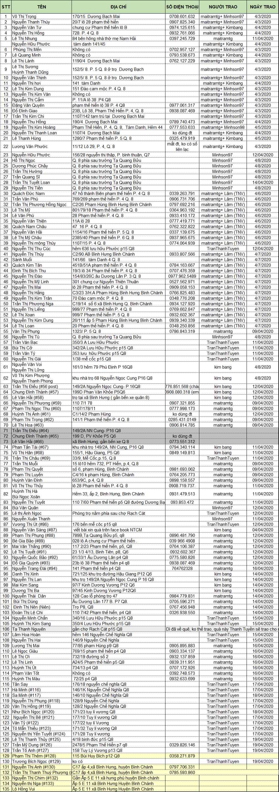Theo sự rà soát và cập nhật của Chi Dang thì tính tới ngày 14/4/3020 chúng ta có 108 hoàn cảnh ( có 3 hoàn cảnh bác Kimbang trao quà bị đăng trùng là : 64 với 71, 65 với 72 và 66 với 73 ).