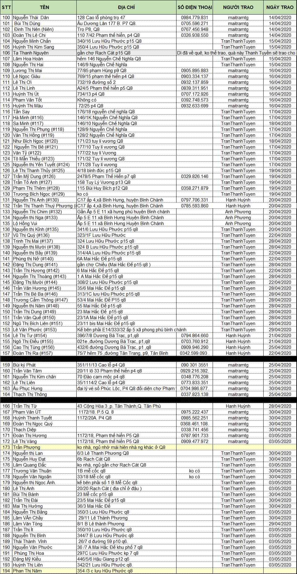 Từ khi phát động chương trình- 31/3/2020- chúng ta đã phát 191 phần quà, theo thống kê của tv Chi Dang lúc 15:18 ngày hôm nay-04/5/20120.
