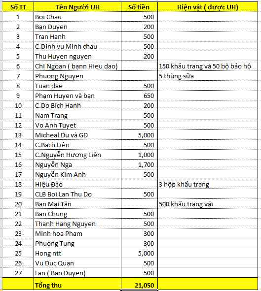 Moij sự đóng góp bằng tiền xin gửi về thủ quỹ của diễn đàn với cú pháp “ tên người UH- NCOVID 19-HN “