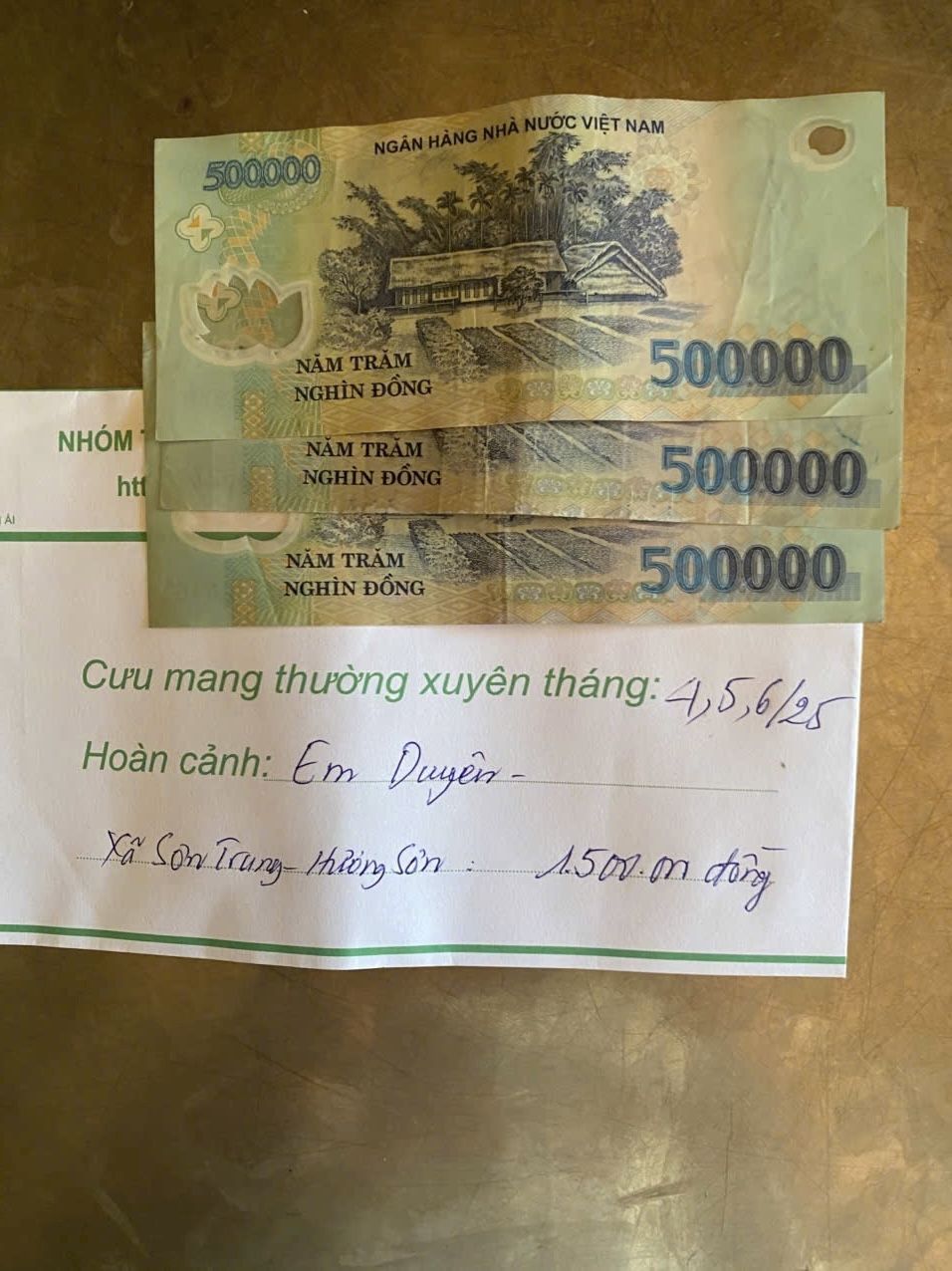 Trong khi chưa có sự chung tay nào thì chúng ta sẽ tiếp tục xuất quỹ NTCM để CMTX Gia đình chị Duyên 500,000₫/tháng từ tháng 4 đến hết tháng 6/2025 các bạn nhé.