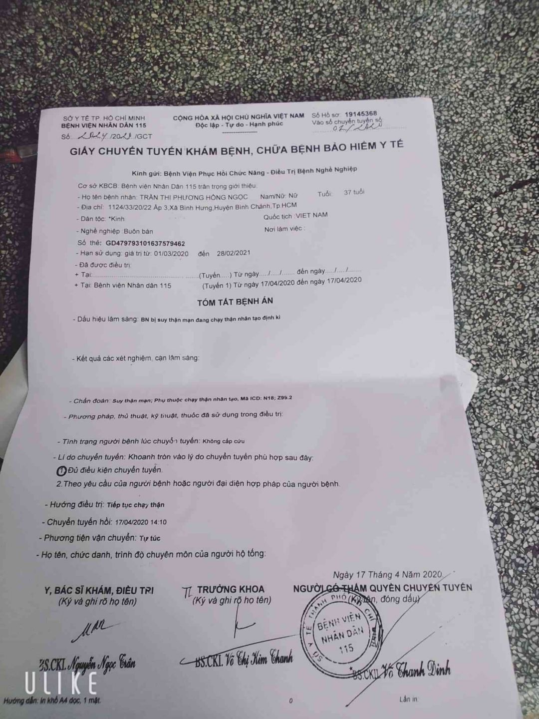 Sáng nay Ngọc có đến bv quân 8 xin chạy thận, ở đây tiếp nhận thẻ BHYT nhưng bệnh nhân chạy thận quá nhiều, không đủ máy nên bv hẹn khi nào có máy trống thì báo. Để duy trì việc chạy thận được liên tục, bv giới thiệu sang bv phục hồi chức năng ( PHCN) quận 8, ở đây có máy nhưng không chấp nhận thẻ BHYT của Ngọc vì đăng ký tại bv đa khoa Vạn Hạnh, cũng không đồng ý cho cô ấy mua BHYT vì hộ khẩu ở Bình Chánh. Nếu muốn chạy thận phải đóng tạm ứng 3.000.000₫( 600.000₫/ lần chạy ko BHYT). Cô ấy đành phải đóng tiền để được chạy thận!