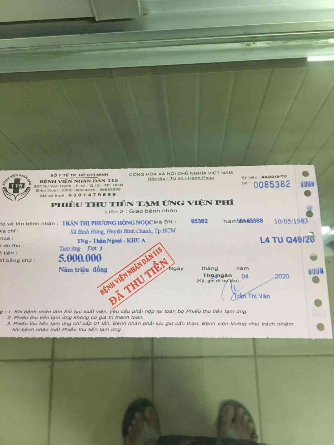 Sáng nay mình đã đưa em Ngọc vào bv 115 đóng tạm ứng viện phí để mổ đặt kim ở tay.
