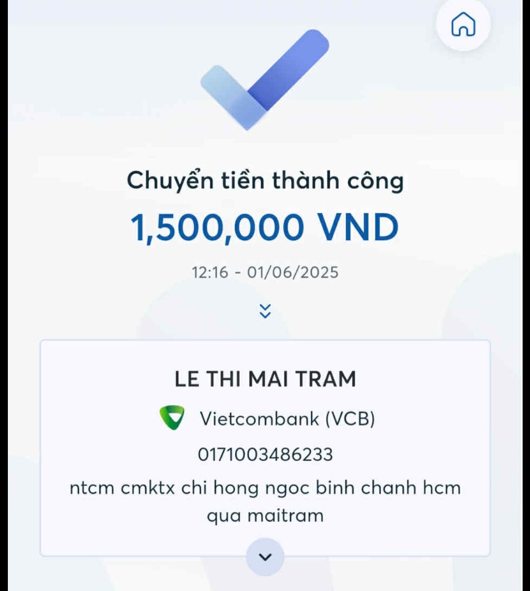 @trangvitgioi : Em chuyển đến @maitramtg 1,500,000₫ để bạn ấy trao tới em Ngọc dùm nhé.