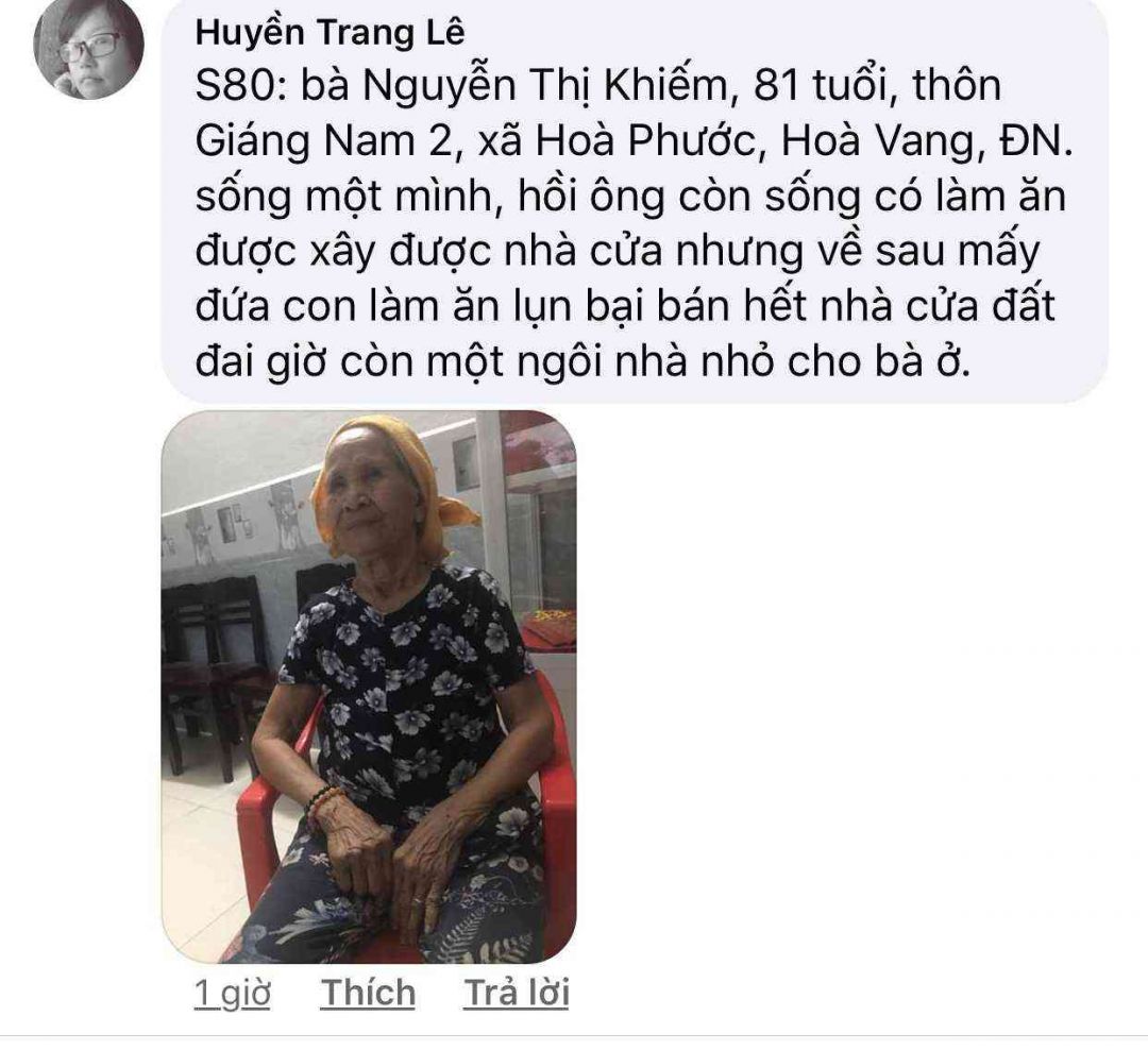 S80: bà Nguyễn Thị Khiếm, 81 tuổi, thôn Giáng Nam 2, xã Hoà Phước, Hoà Vang, ĐN.