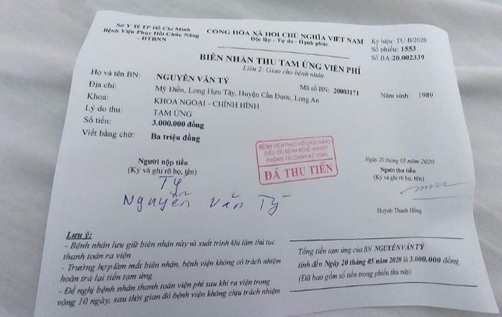 Em xin chào cả nhà em cảm ơn cả nhà đã giúp cho em hôm nay chị mai trăm có vô bv phục hồi chức năng chao cho em1 thùng sữa và2bịch tả nhưng em chỉ nhận1bịch thôi và em nhận số tiền trong hội ntcm là 5tr500k và chú vinh 2tr nữa tổng cọng là 7.500k em cảm cả nhà nhiều lắm. Còn chuyện sư cô hứa giúp cho em sư cô kêu lên bv chợ rẫy .sư cô làm giấy tờ chuyển viện lên chợ rẫy sư cô có nói cho em số tiền là 16tr và sư cô nói để sư cô giữ giùm em có đống tiền gì đó sư cô vô đống chứ 1 mình em sư cô nói mất sau đó sự cô về đồng tháp rước bệnh nhân lên sau đó em không còn gặp sự cô nữa sư cô nói con không đủ duyên nên sư cô không giúp.sao đó em chuyển viện qua bv phục hồi chức năng gặp chị mai trăm và anh tài với chị hạnh đưa em vào viện và chị mai trăm có nhờ bác sĩ hảo chữa cho em