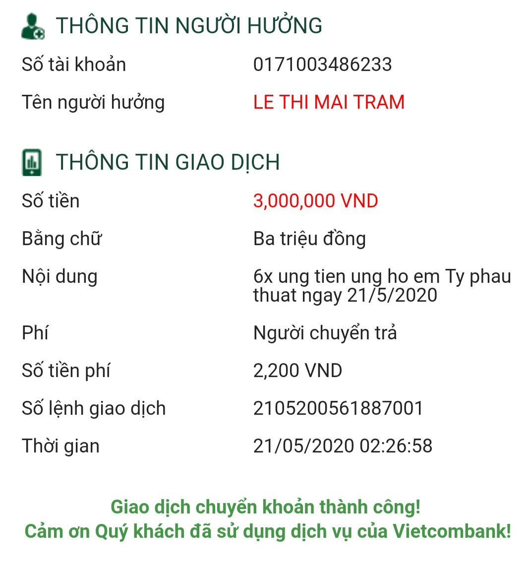 Mai Trâm xin gửi lời cảm ơn gia đình Michele-du. Đã ủng hộ cho em Tý 1triệu cảm ơn Tina ủng hộ tiền ăn để bồi dưỡng sức khỏe 500k còn 2triệu cảm ơn cả nhà đã xuất quỹ  ủng hộ cho emTý