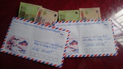 Lúc đầu Quang định khi nhận gạo, nhu yếu phẩm tháng 3/2021 sẽ trao số tiền CMTX tháng 2 và 3 của năm 2021 cùng một lần nhưng thấy quà CMTX tháng 3 là gạo và nhu yếu phẩm hơi lâu. Vì vậy, chiều nay (4/4/2021) Quang đã đến trao tiền CMTX của tháng 2 (vì có sự hiểu lầm nên việc trao quà thàng 2 không được kịp thời. Mong quý mạnh thường quân thông cảm) và 3 cho gia đình anh Đặng Cu.