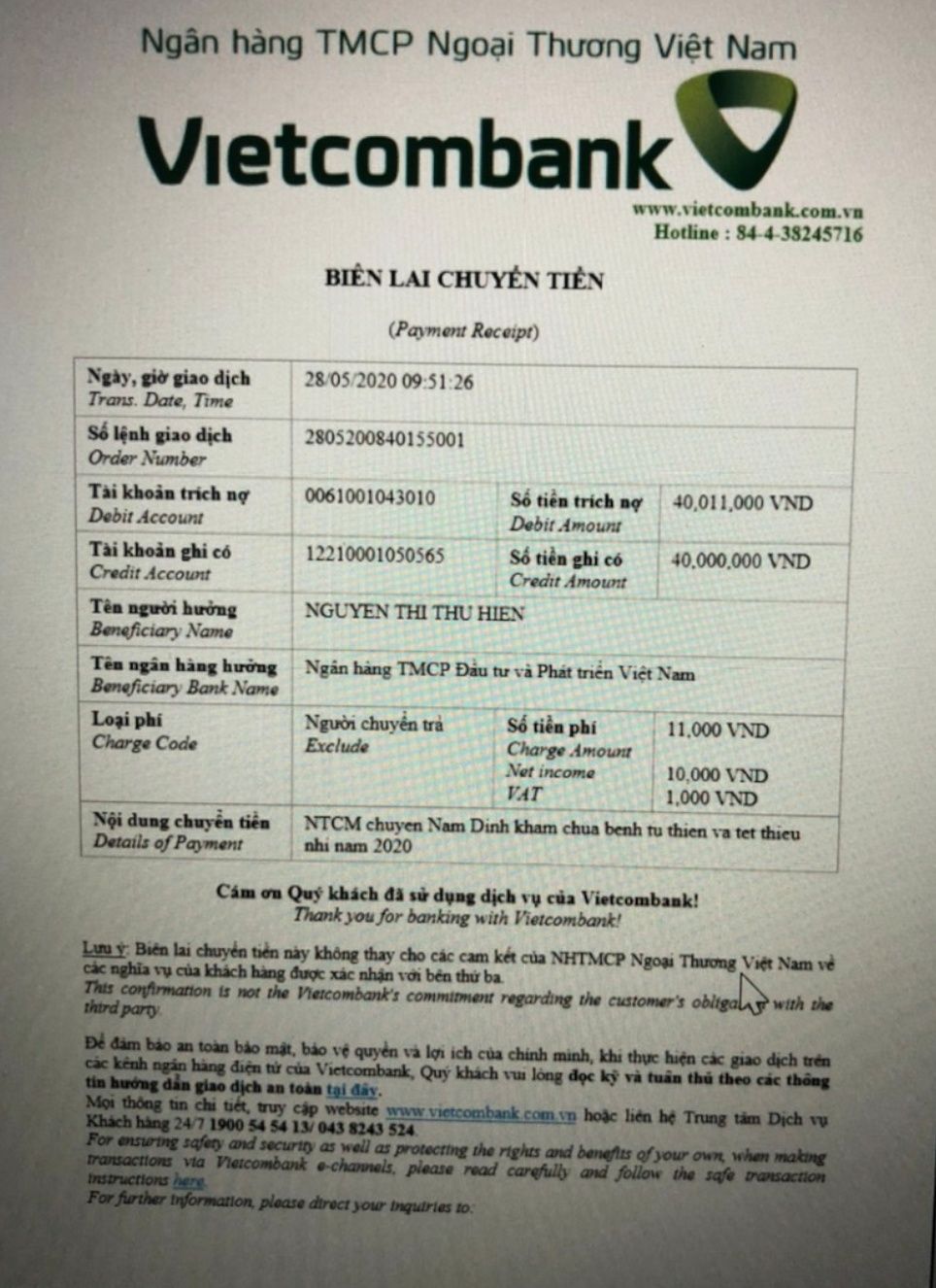 Chủ TK: Nguyen Thi Thu Hien. STK: 12210001050565. Ngân hàng BIDV chi nhánh Hà Thành.