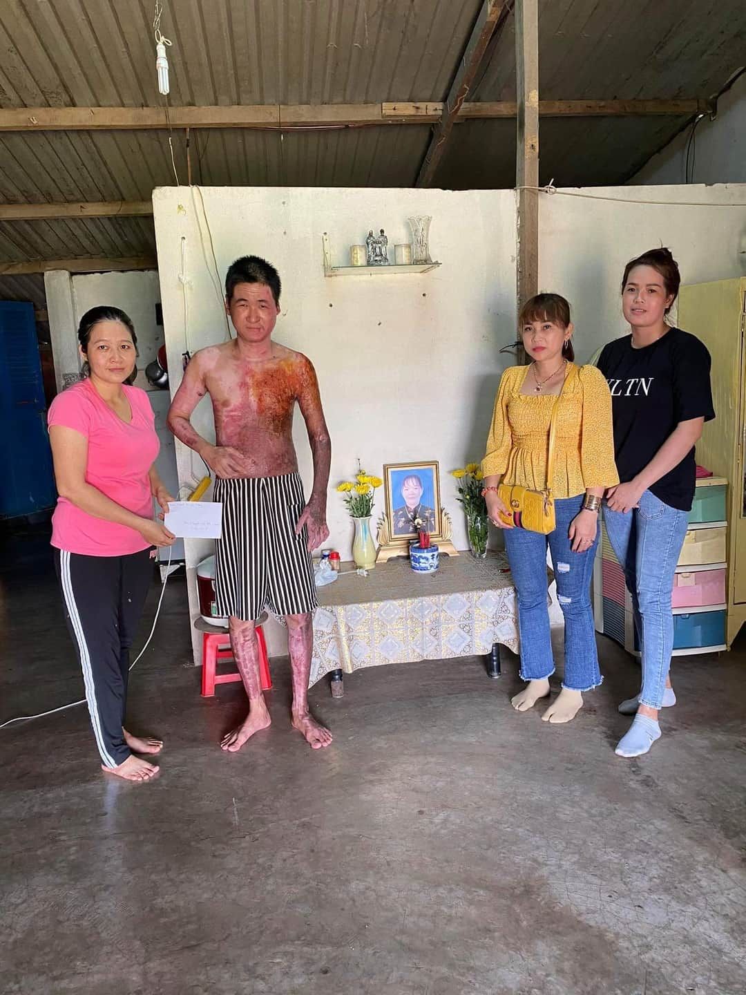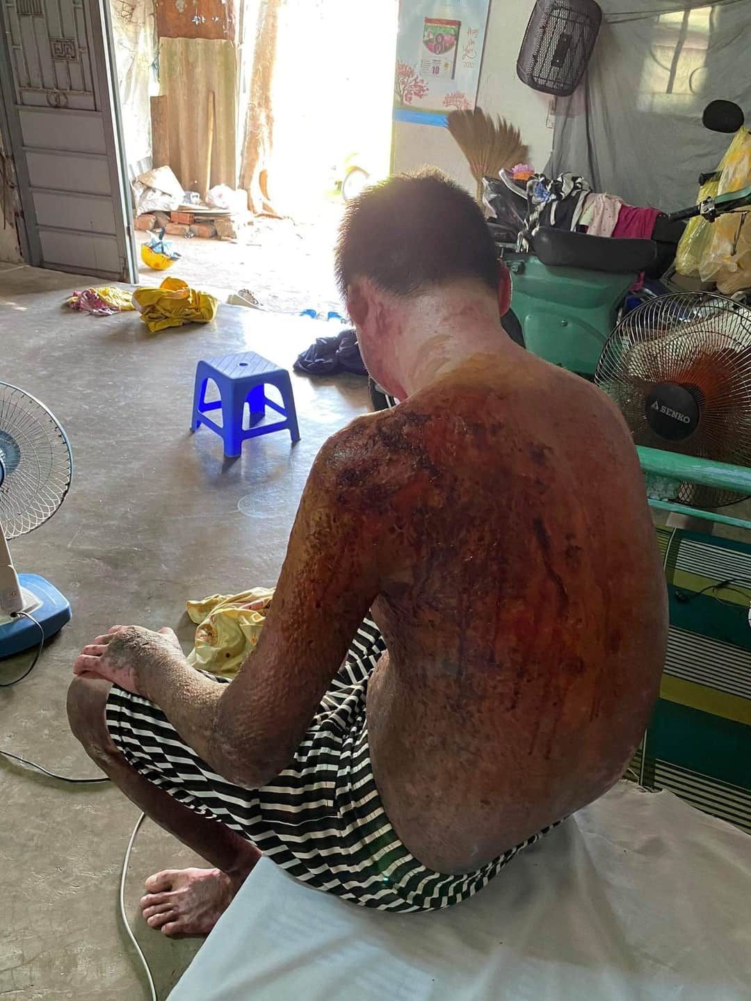 Em Tiến, 20t, và mẹ em bị người ta tạt xăng vào phòng trọ. Mẹ em đã chết. Em bị phỏng toàn thân, biến dạng, lở loét đau nhức khắp người. Em lại bị bệnh tim, sức khỏe yếu. Hiện dì ruột đang chăm sóc em. Tất cả giấy tờ chữa trị, công an đang tạm giữ để điều tra vụ án. Người gây án đang bị giam. Chi phí chữa trị ở BV (theo dì em nói): 194tr. MTQ giúp 154tr, số còn lại là gia đình người thân giúp. Vụ án chưa được xét xử, chưa có sự bồi thường. Và hiện tại, em Tiến không nhận được đồng nào + lời thăm hỏi của gia đình người gây án. Người gây án có tình cảm với mẹ em, nhưng mẹ em từ chối nên người ấy trả thù (theo ý lời kể của em Tiến + dì ruột).