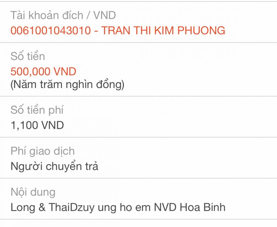Lathuvang đã trung chuyển TK Thocon 1,000,000đ hổ trợ em NVD của Michele_du và Gia Đình.
