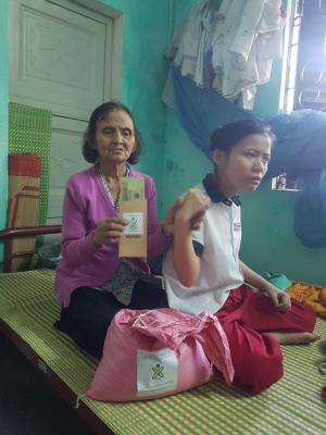 Hôm nay em đã đi trao phần quà CMTX tháng 02/2021 và phần quà Tết đến hộ bà Thơm rồi ạ.
