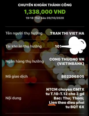 @Thocon : Em xuất quỹ chuyển tới Tran Ha 566,000đ tiền CMTX Gia đình bác Liên trong 3 tháng kể từ tháng 10/2020 dùm.