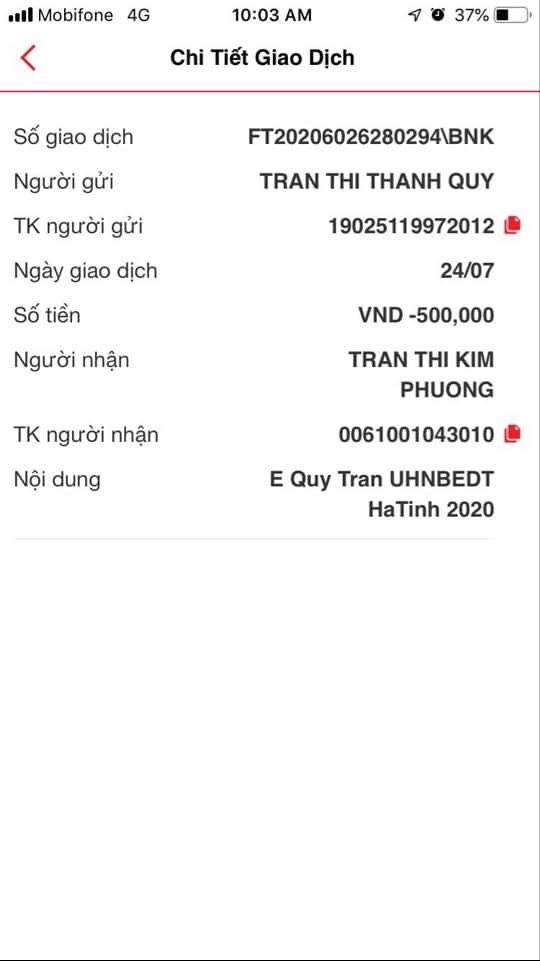 Tổng đến thời điểm hiện tại nhóm Hà Tĩnh nhận được là: 18, 800,000đ và một số hiện vật ah.  Cảm ơn cả nhà đã luôn yêu thương Hà Tĩnh ah.  Chương trình còn thiếu rất nhiều kinh phí mong rằng sẽ nhận được nhiều hơn nữa sự chung tay của cả nhà ah.