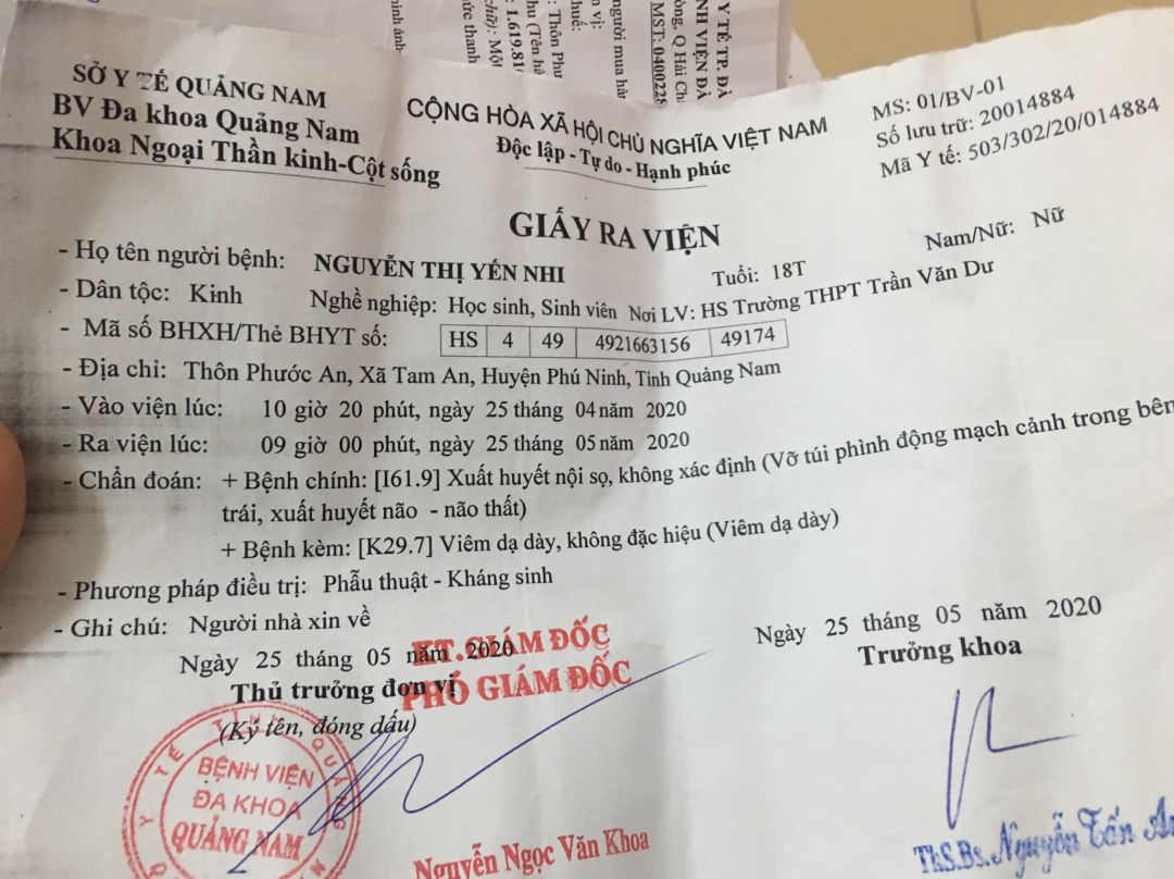 Được biết em Nhi nhập viện ngày 25/4 tại BV TAM KỲ, điều trị 1 tháng thì chuyển ra BV ĐA KHOA ĐÀ NẴNG, sau đó 1 tuần thì xuất viên về nhà, nhưng do bệnh tình tiếp diễn nên hai mẹ con lại khăn gói ra ĐÀ NẴNG tiếp tục khám và điều trị cho Nhi.