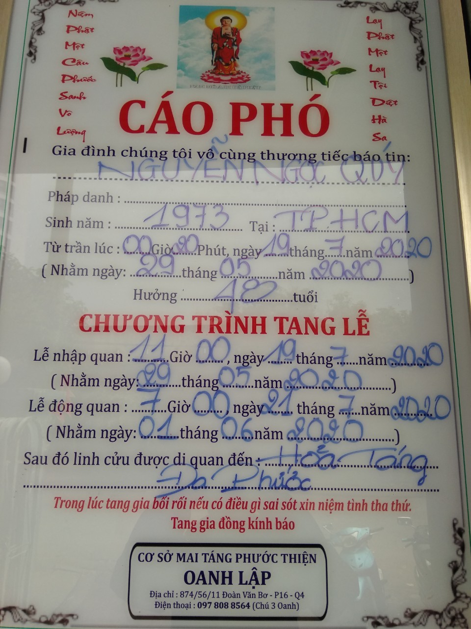Anh đã mất lúc: 00h20 ngày 19/7/2020 ( nhằm ngày 29/5/2020al) .