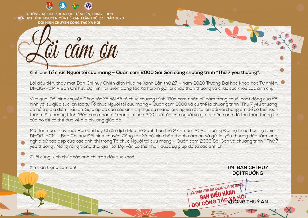 Chào cả nhà ạ, hôm nay em gửi mọi người thư cảm ơn chính thức từ Ban Chỉ huy Chiến dịch Mùa hè Xanh Lần thứ 27 – năm 2020 Trường Đại học Khoa học Tự nhiên, ĐHQG-HCM – Ban Chỉ huy Đội hình chuyên Công tác Xã hội.
