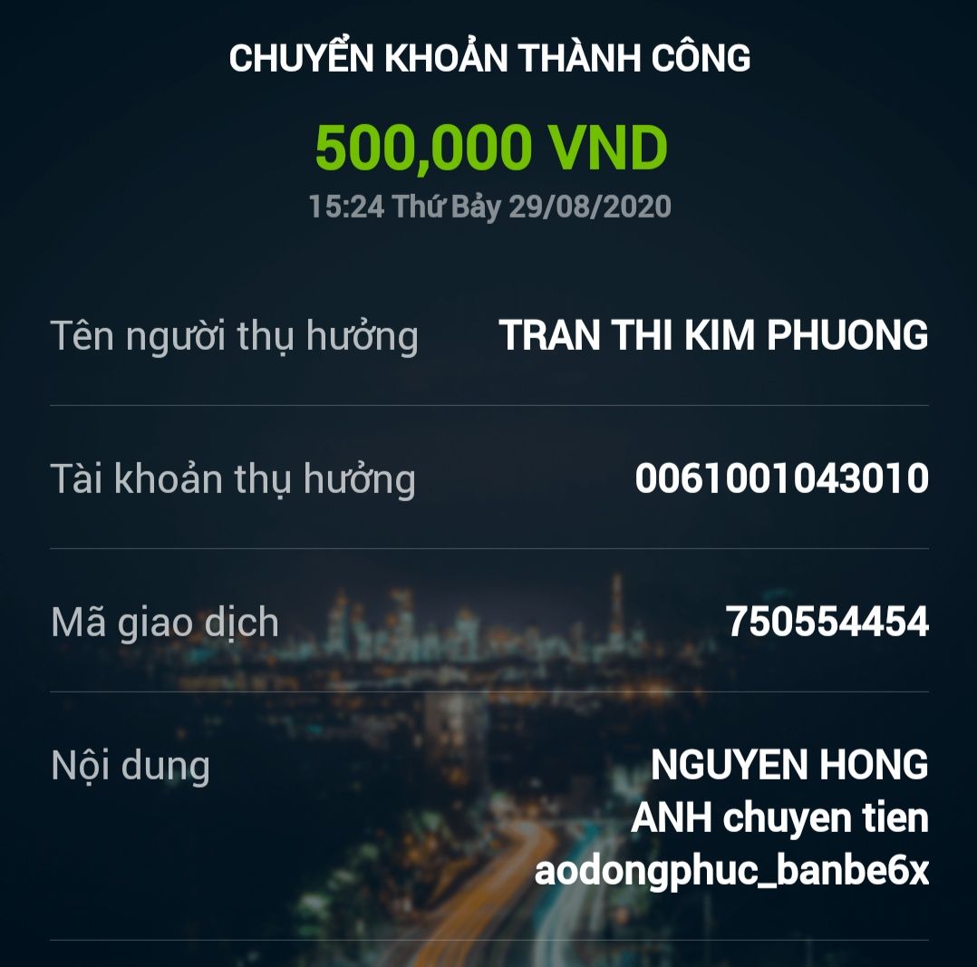 * Tiền cọc 50% thủ quỹ chuyển khoản giúp vào TK Vietcombank của Letuantu luôn nhé ạ.