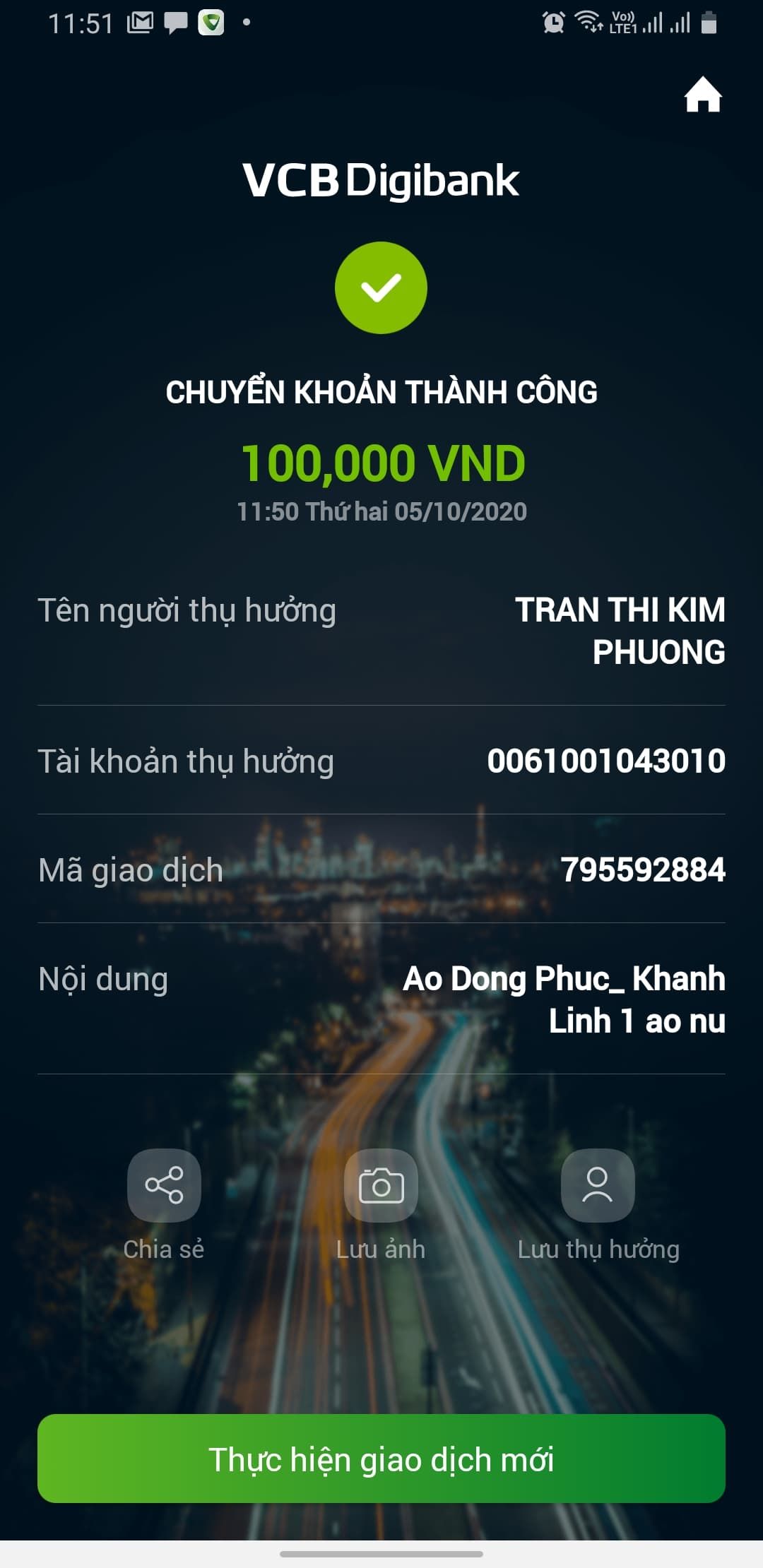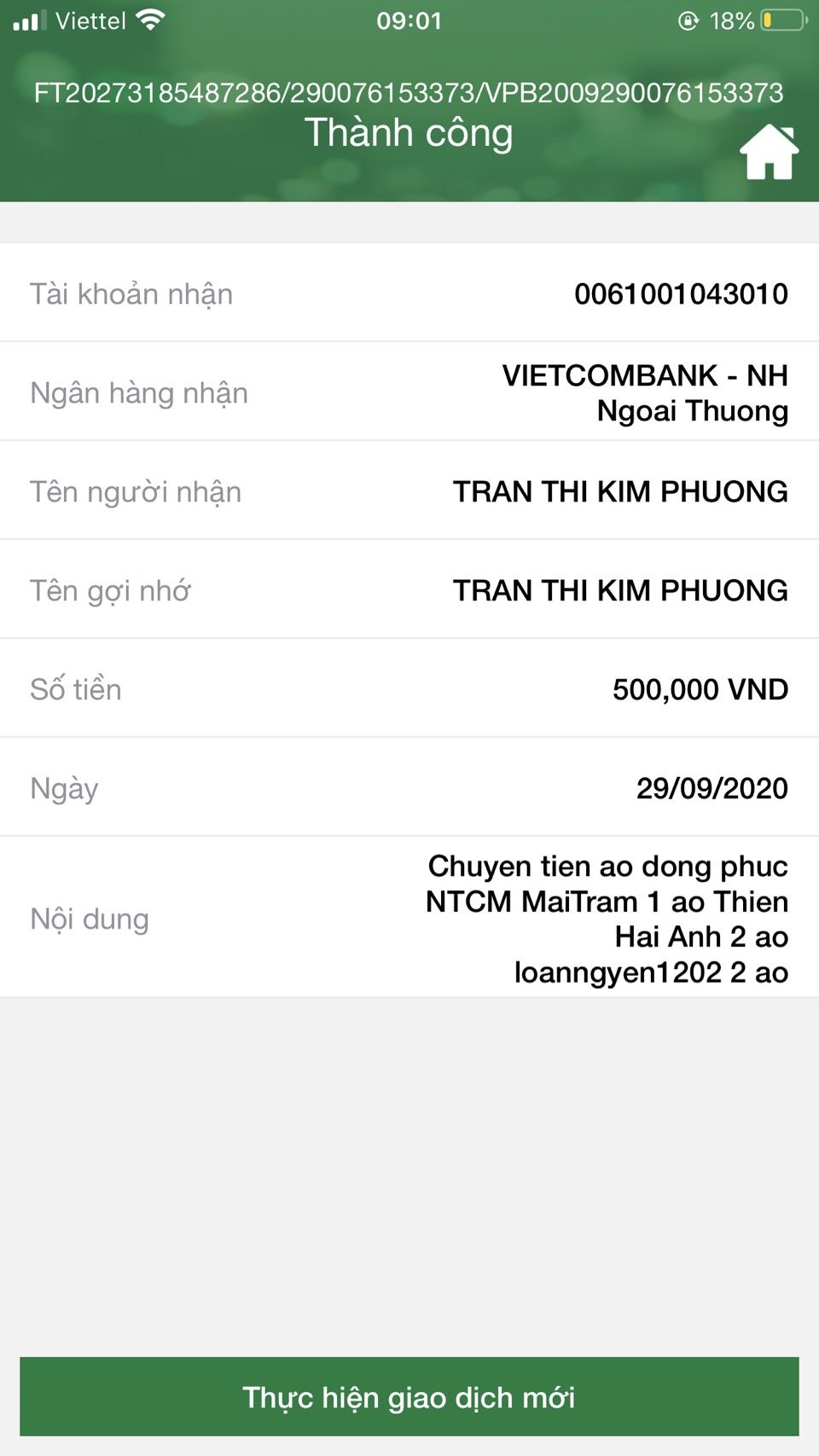 Loannguyen đã chuyển khoản tiền áo hôm nay nhận vào TK chị Thỏ con rồi ạ.