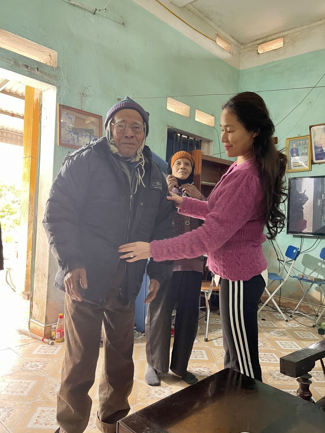 Ông bà vẫn khoẻ, trời lạnh nên bà k đi chợ, chỉ ở nhà rau cỏ ở vườn và cơm nước cho các bạn. Em mang về 1 ít thực phẩm và mua tặng ông bà 2 cái áo rét, ông bà phấn khởi lắm, mặc luôn 😍. Gấu mèo nhà em cũng gửi cho Trung Hiếu 2 áo khoác sinh đôi giống nhau, may quá các bạn vừa xinh❤️