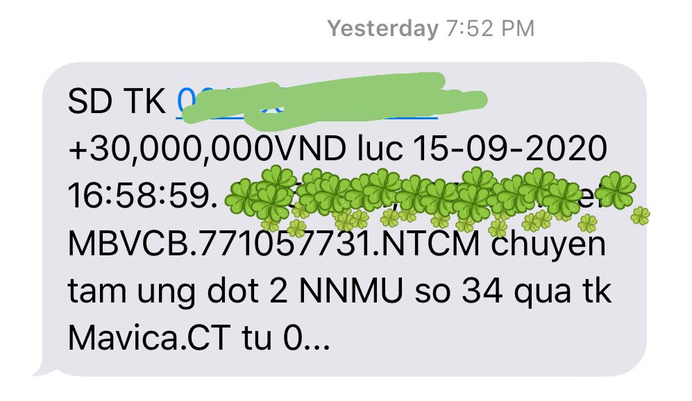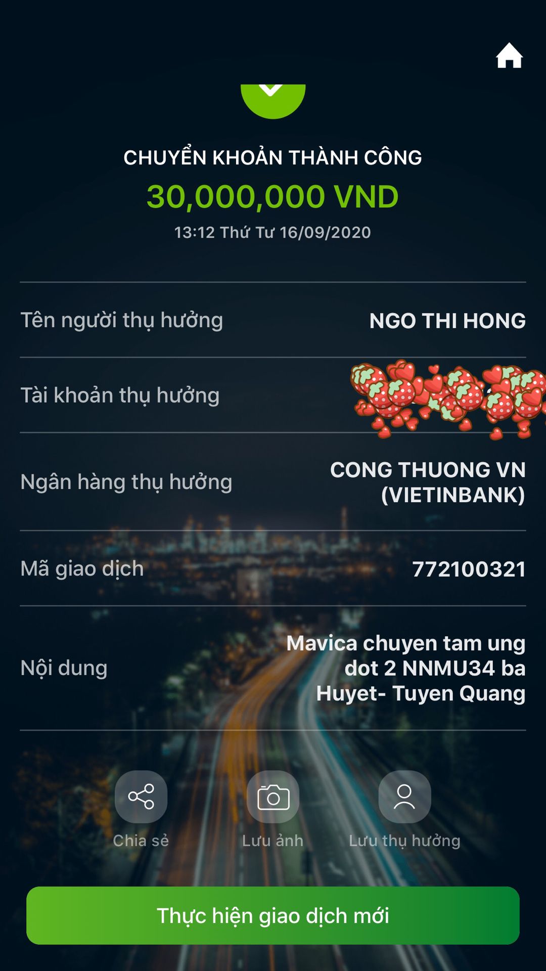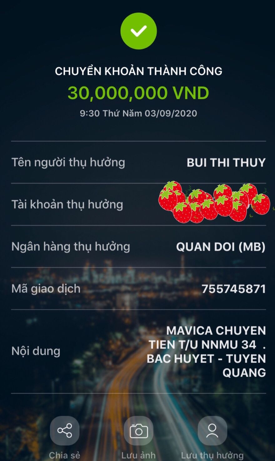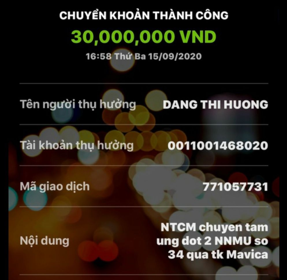 Mavica đã nhận được khoản tạm ứng lần 2 là 30.000.000đ và đã chuyển tới tài khoản người nhận.