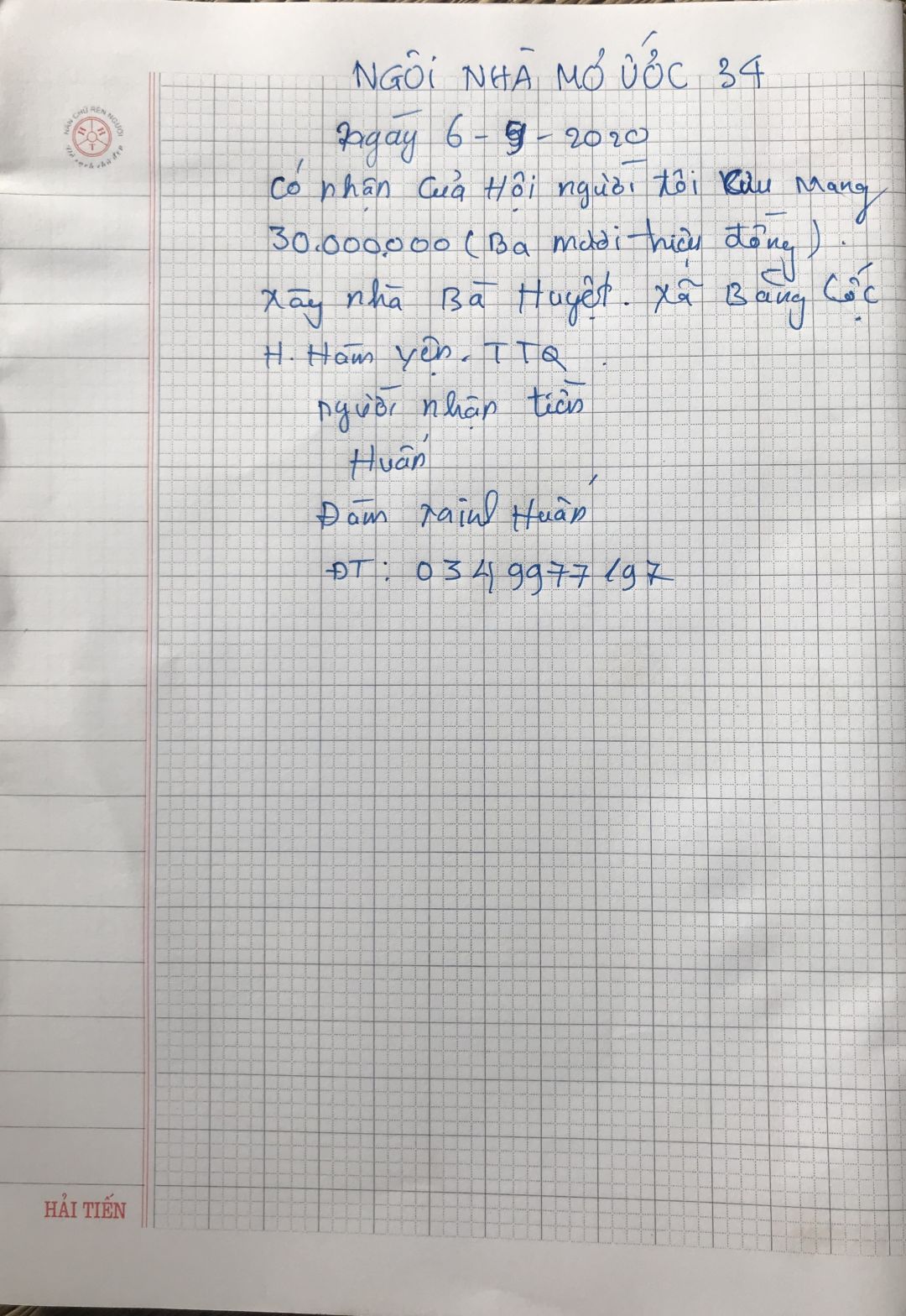 Ngôi nhà Mơ ước số 34 (NNMU34) dành cho gia đình bà Hoàng Thị Huyệt, thôn Phúc Long, xã Bằng Cốc, huyện Hàm Yên, Tuyên Quang lập một kỷ lục mới trong xác minh, kêu gọi và xây dựng. Từ lúc khởi công tới khi hoàn thành cơ bản chỉ vỏn vẹn 21 ngày. Tiếc là mùa này mưa nhiều nên tường vẫn còn ẩm chưa sơn hoàn thiện cho gia đình bà. Nhóm Bọ Thủ đô, như mọi khi, hỗ trợ lắp đặt hệ thống điện cho NNMU34.