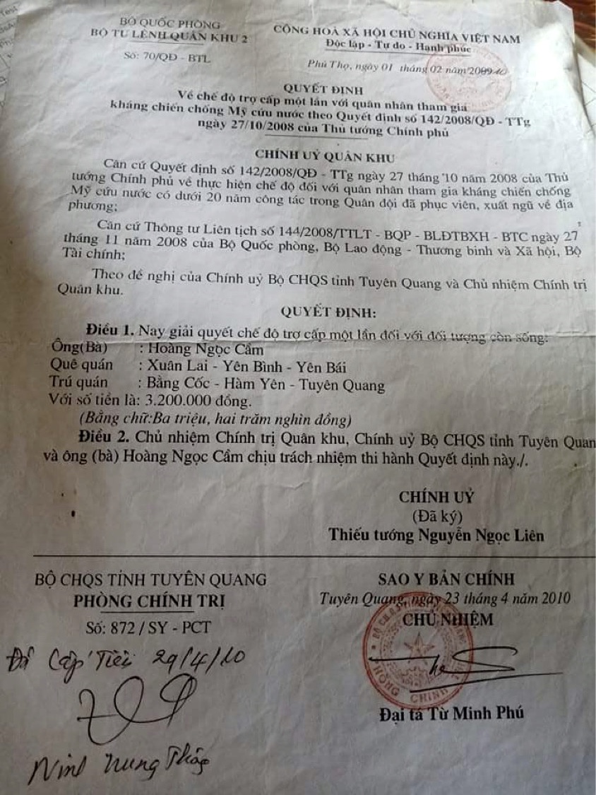 Gia đình bà Hoàng thị Huyệt -Bằng cốc - hàm yên -Tuyên Quang. Ông bà sinh được 3 người con (1 con trai,2 con gái)thì cả 3 người đều nhiễm chất độc màu da cam. Chồng bà Huyệt - ông Hoàng Ngọc Cầm, người đã từng tham gia kháng chiến và nhiễm chất độc màu da cam,đã mất.Con trai lấy vợ thì vợ mắc cũng mắc bệnh.con trai của anh chị mắc chứng bệnh thiểu năng trí tuệ.