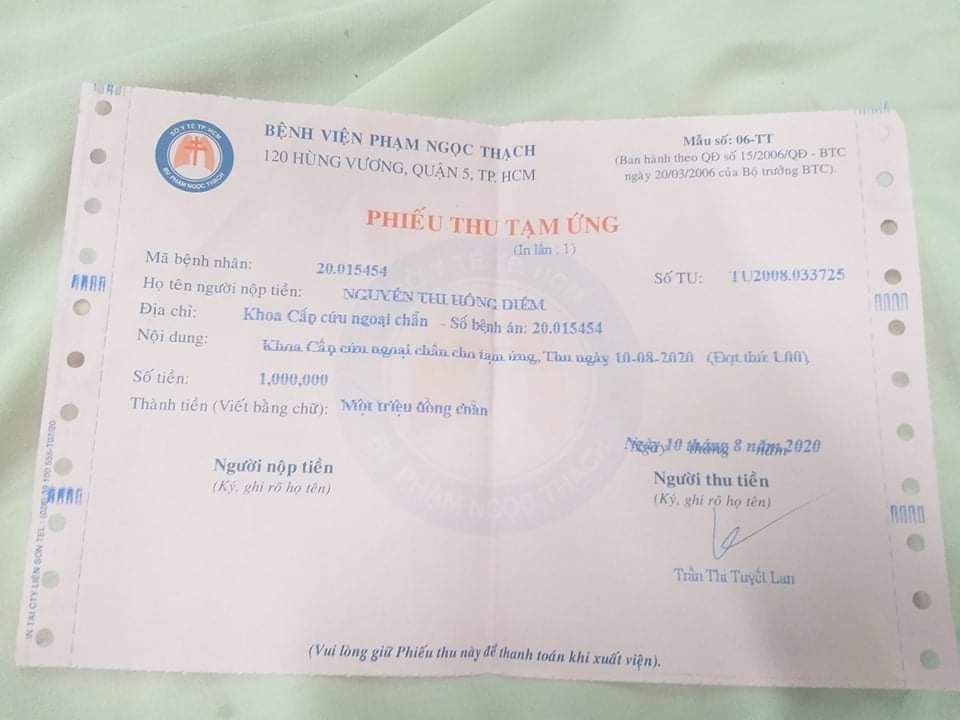 Từ hôm nhập viện đến nay, chị đã nộp 1 triệu tiền tạm ứng cho bệnh viện.