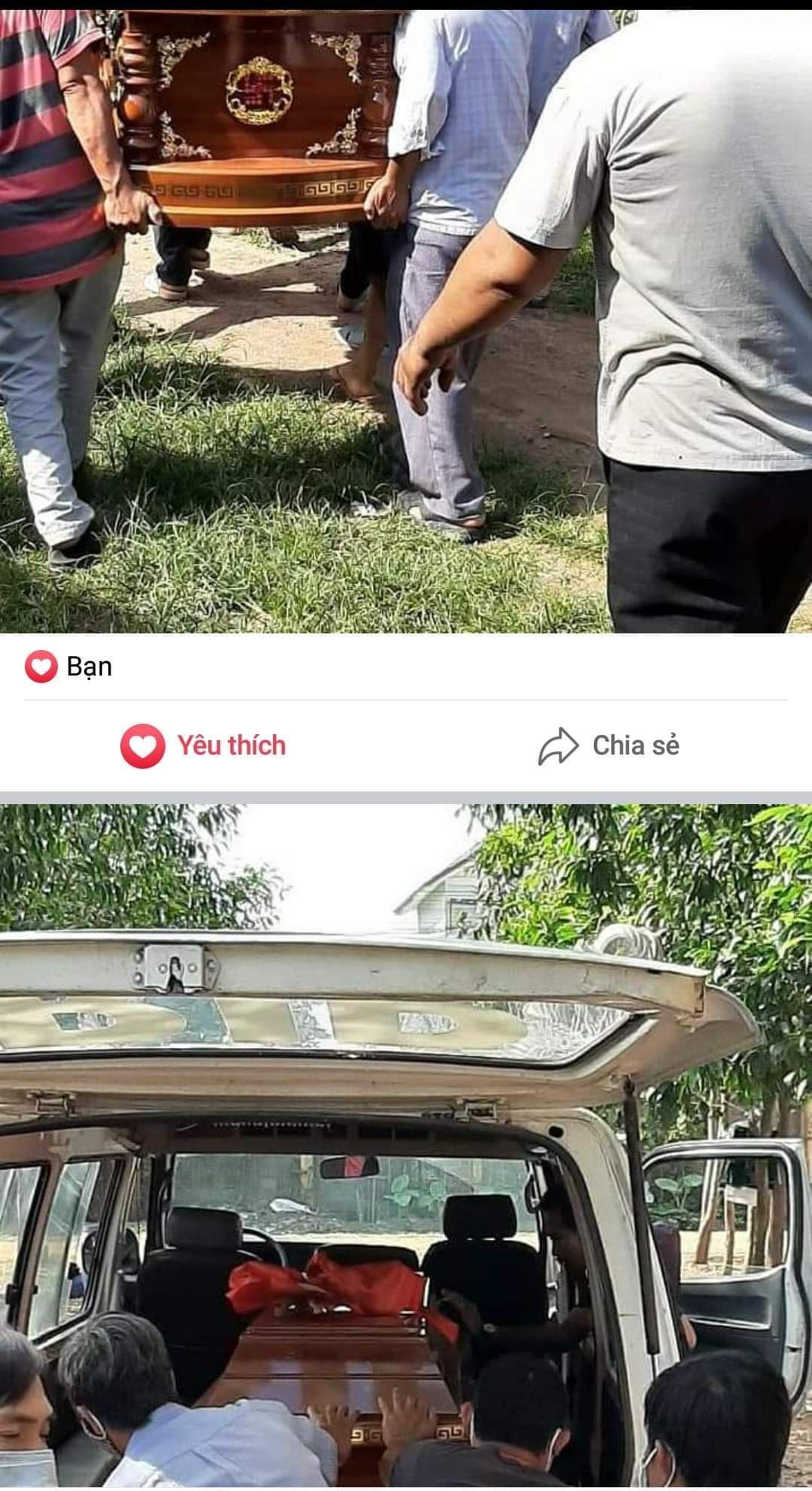 Sau khi được mọi người quan tâm giúp đỡ trong đó bà con hàng xóm gần đây, công ty Thanh Bình hỗ trợ 5 triệu đồng, nhóm từ thiện Trái tim yêu thương ở Trảng Bom hỗ trợ hòm ( đầu tiên chưa có ai hỗ trợ nên đưa hòm bên dịch vụ mai táng tới rồi nên bên dịch vụ mai tang đã đồng ý để luôn hòm ( quan tài ) ở lại và chuyển hòm từ thiện về dịch vụ mai táng ), vào sáng sớm chưa có ai giúp đỡ nên mình đã đề xuất hỗ trợ khoảng 5 đến 6 triệu nhưng đến trưa thì có thông tin cuối cùng nên mình đã trao đổi với bác banbe6x hỗ trợ 1 triệu tiền phúng điều từ diễn đàn nên mình đã tạm ứng 1 triệu trao cho cô Nhẫn. Về dịch vụ mai táng không tính tiền khuân quan tài mà nhờ hàng xóm hỗ trợ. Do làm khẩn trương nên cáo phó không được viết ra.