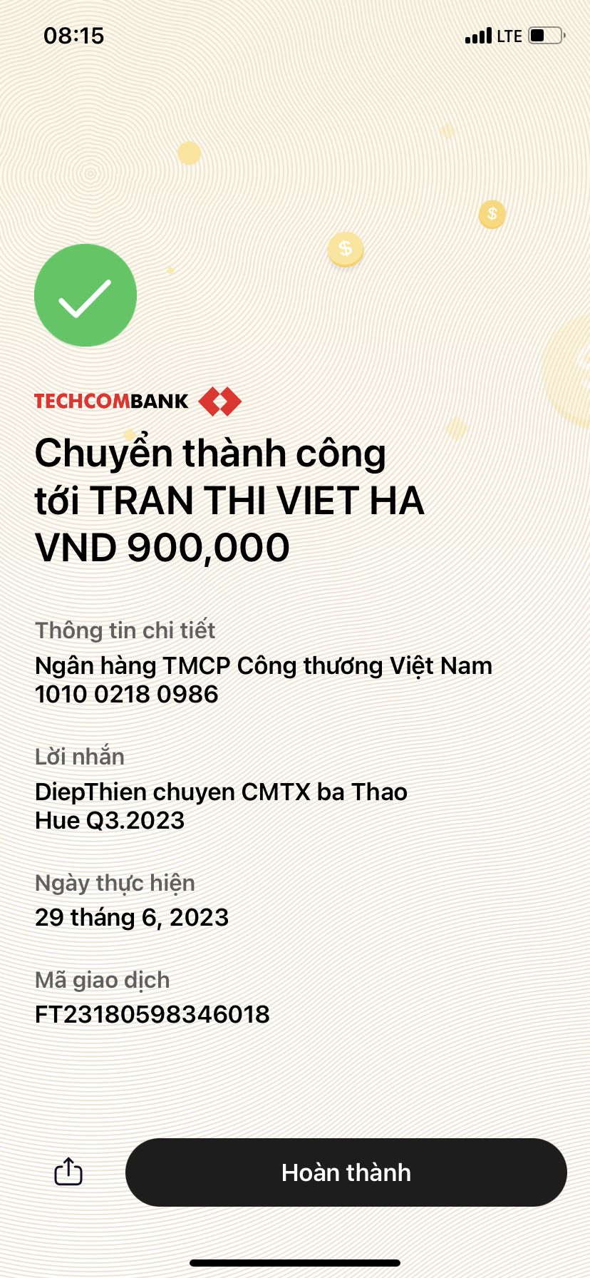 DiepThien xin gửi phần CMTX Q3.2023 tới bà Thảo. Nhờ Hà Trần tiếp tục thăm hỏi động viên bà nhé!