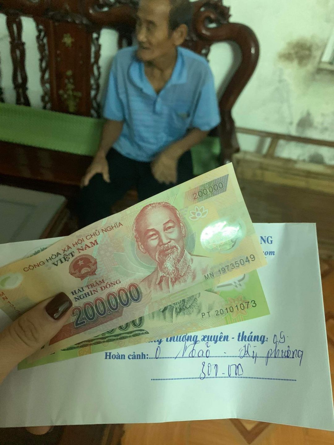 Sau khi gọi điện trao đổi nhanh với chú 6x thì Thu Huệ đã ứng trước hỗ trợ hoàn cảnh 400.000₫ làm quà động viên hoàn cảnh.