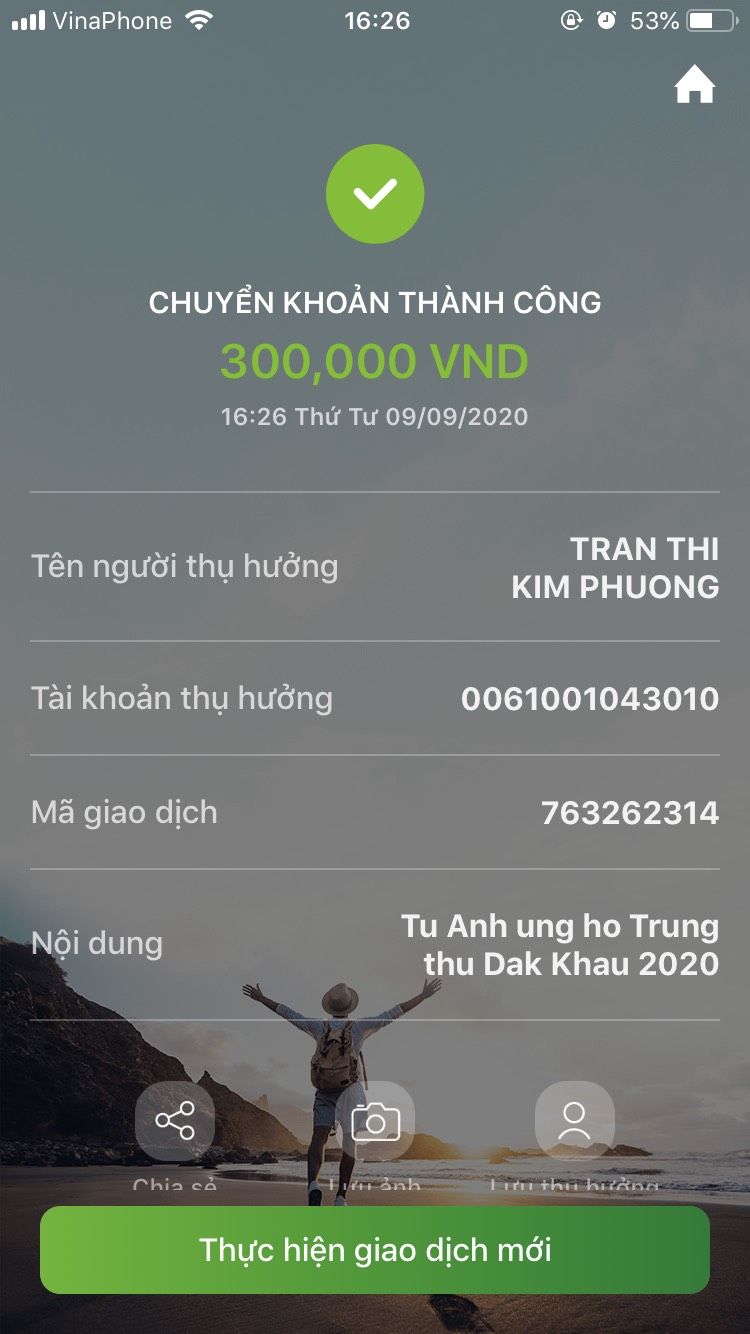 - MTQ có số GD 483383.080920.163410 ủng hộ 500,000đ (đã chuyển khoản 8/9)
