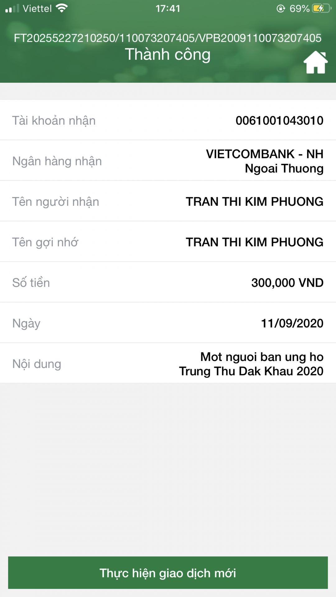 Gia đình chị Huynh Tran + Do Ngoc Quan ủng hộ cho chương trình 2,000,000đ, chị đã chuyển tiền vào tài khoản chị Thỏ.