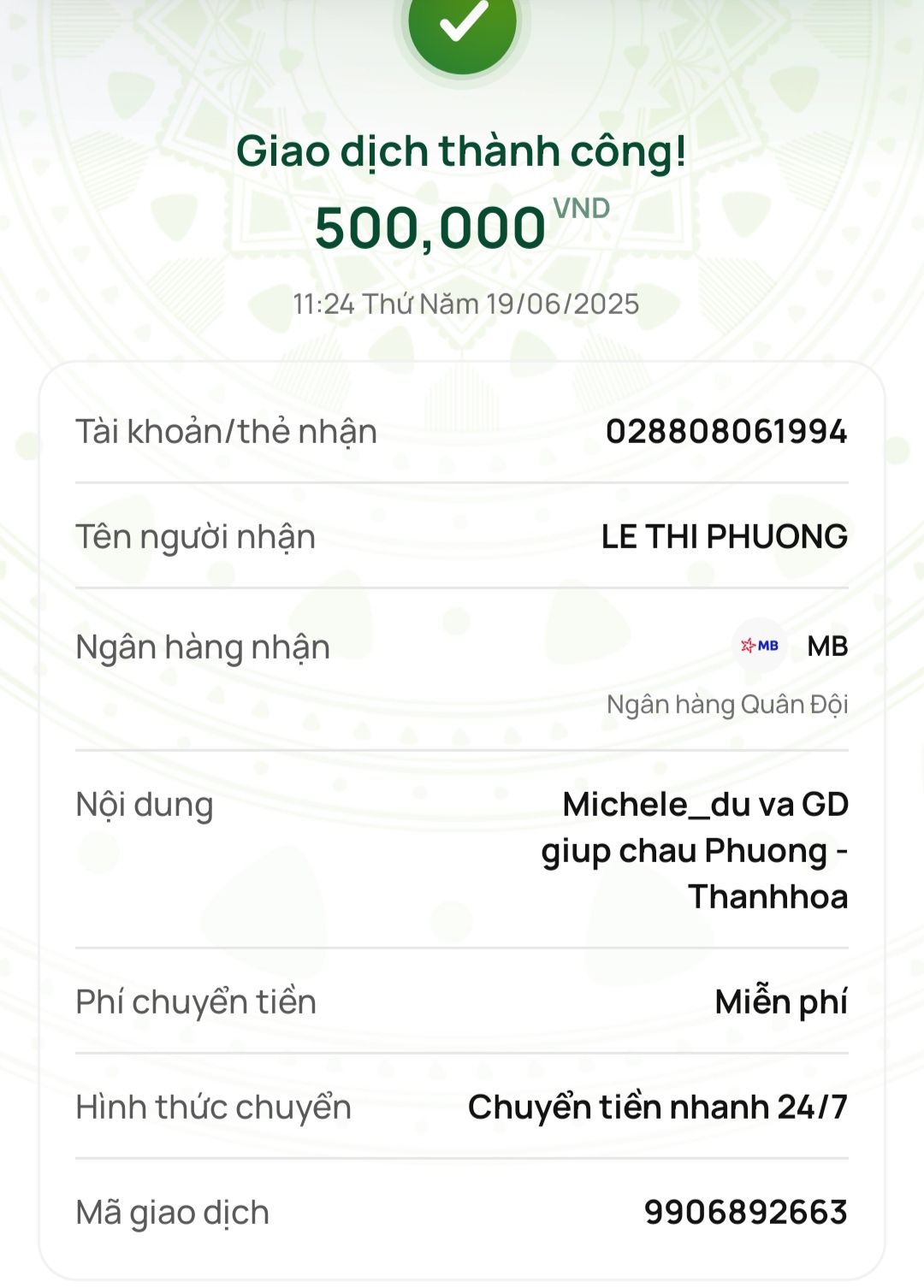 6x cũng mới liên hệ với cháu Phương để xin số tài khoản chuyển tiền và cũng chuyển tới cháu 500,000₫ Michele_du và Gia đình ủng hộ.