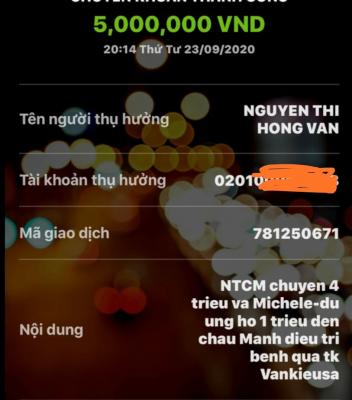 @Thocon : Em chuyển tới Vânkiêusa 5,000,000đ (Michele_du: 1,000,000đ, xuất quỹ 4,000,000đ) tiền giúp cháu Mạnh điều trị bệnh dùm nhé.