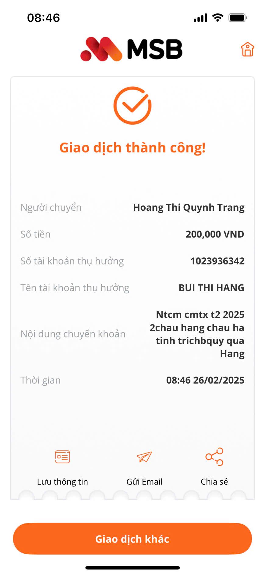 Cô đã chuyển tiền hỗ trợ quý 2/2025 tới tài khoản của Hằng. Chúc hai chị em luôn mạnh khoẻ và học tập tốt!