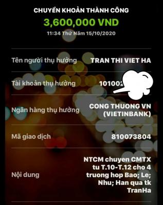 @Thocon : Em xuất quỹ chuyển tới Tran Ha 900,000đ tiền CMTX Gia đình cháu Bảo Thy trong 3 tháng kể từ tháng 10/2020 dùm.