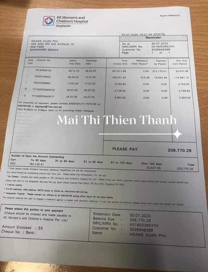 - Tình hình tháng 10/2020 hiện tại: Sang tháng mới bv sẽ bắt trả nợ như Mẹ Thanh đã kí lãnh nợ phải trả 170 triệu tiền viện và tiền khám vào thuốc hằng tuần từ $3000-$4000 SGD ( 50-60 triệu VND). Sang tháng phải có 230 triệu để chi trả. Bếu ko có tiền duy trì thì con sẽ phải về VN khi bệnh tình chưa điều trị dứt . Con sắp về đích rồi xin các cha mẹ đừng buông tay con . Xin hãy cứu giúp con cho con 1 cơ hội dc sống khỏe mạnh quay về quê hương . Các cha mẹ miền Bắc Nam cứu giúp con mỗi người cho con xin 1 chút góp gió thành bão. Mọi giúp đỡ xin chuyển khoản vào số tk của bố con ( mình sẽ copy ở đây, cộng thêm mn vào link bài facebook của gia đình bé bên dưới để đọc và xác nhận dùm số tài khoản chuyển khoản):