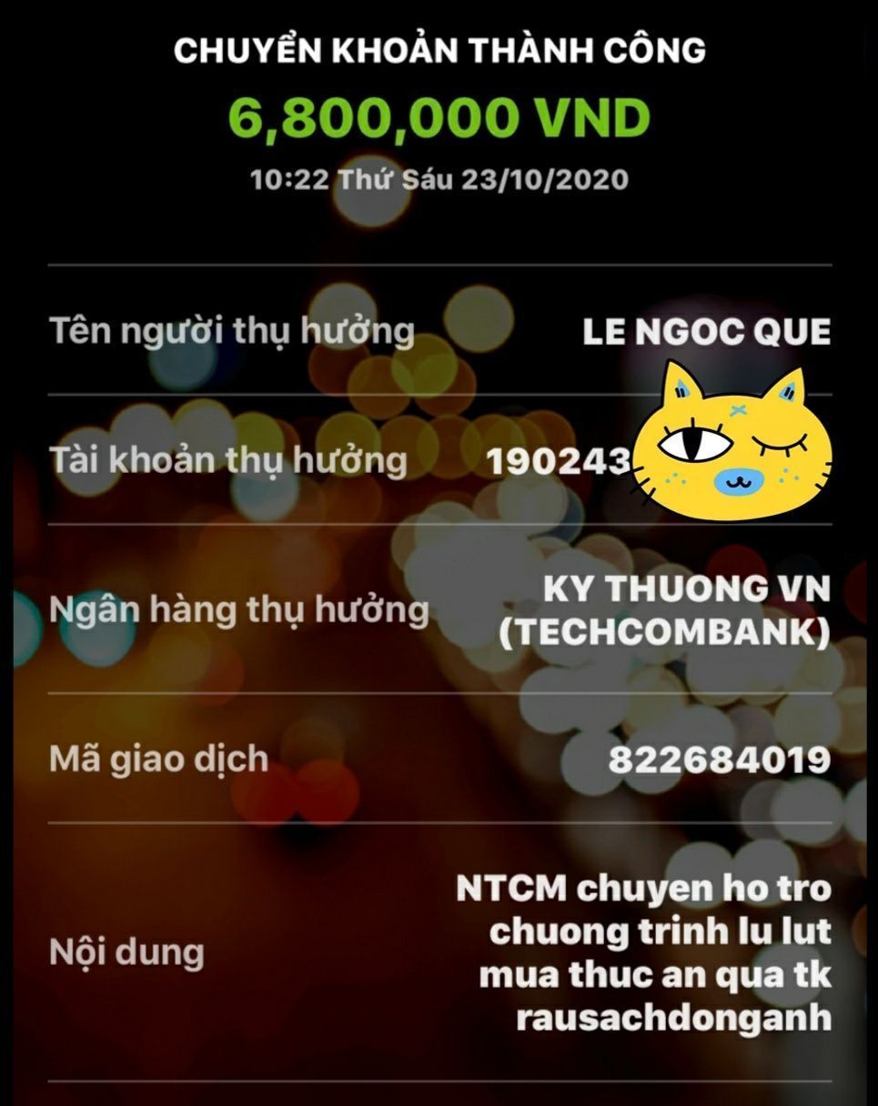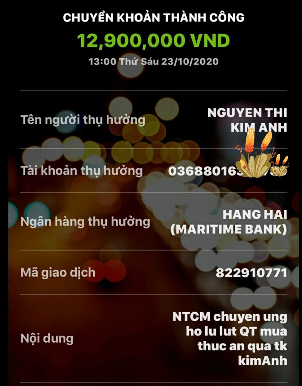 Mình không chuyển khoản trực tiếp được nên đã gởi phần ủng hộ về địa chỉ của bạn Thocon vào ngày 10/21/2020. Khi nào nhận được xin bạn thông báo dùm mình nhé.