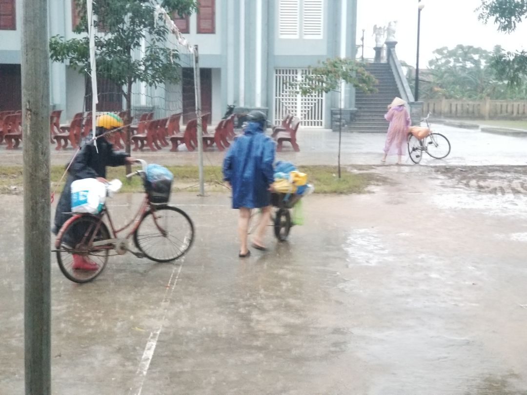 Đoạn đường xuống Triệu Hoà 10km, một số đoạn còn ngập nước nhưng xe 16 chỗ và xe tải vẫn an toàn đi qua được, đoàn chia đôi phát ở 2 thôn của xã Triệu Hoà - Triệu Phong - Quảng Trị