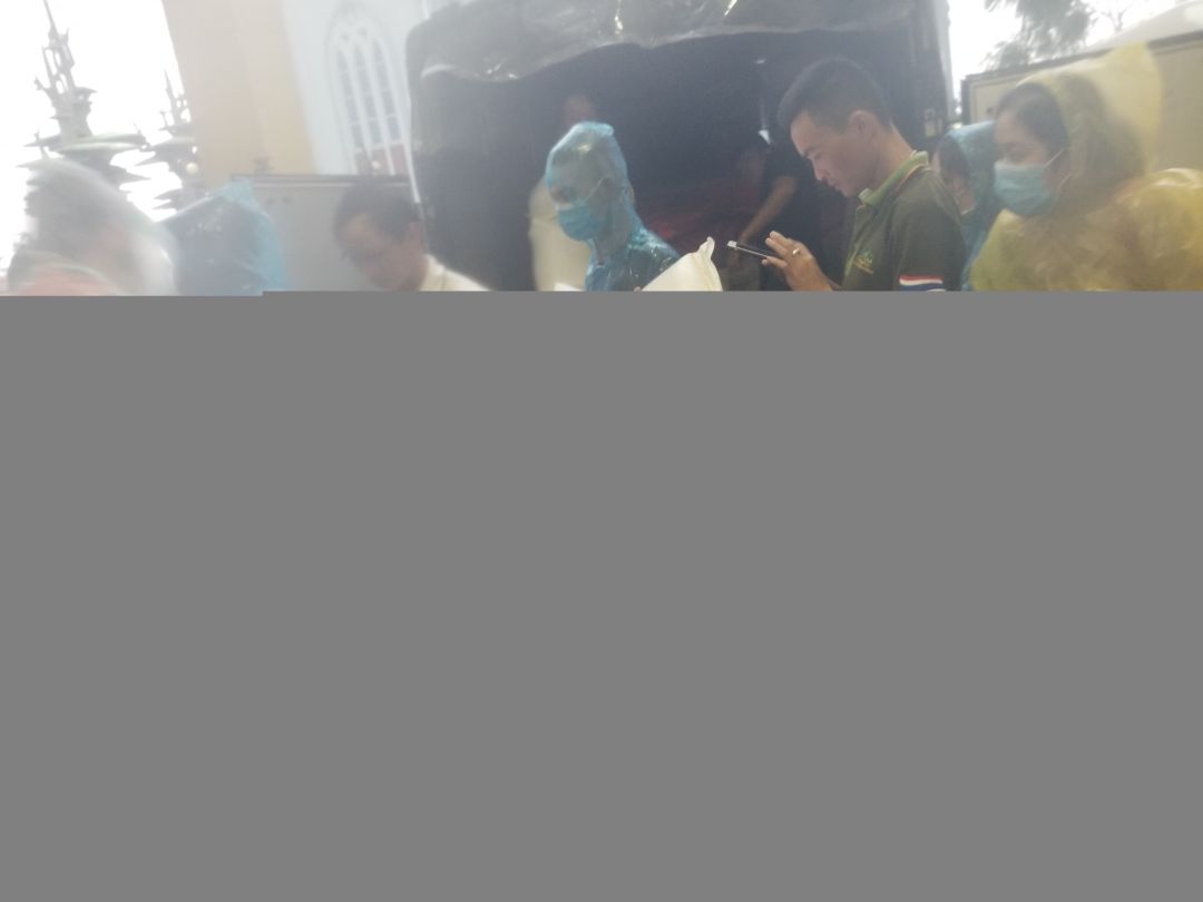 Mưa tầm tã nên công việc phát quà cũng khá vất vả, hội trường còn nguyên lớp bùn non nên phải phát ở hành lang.