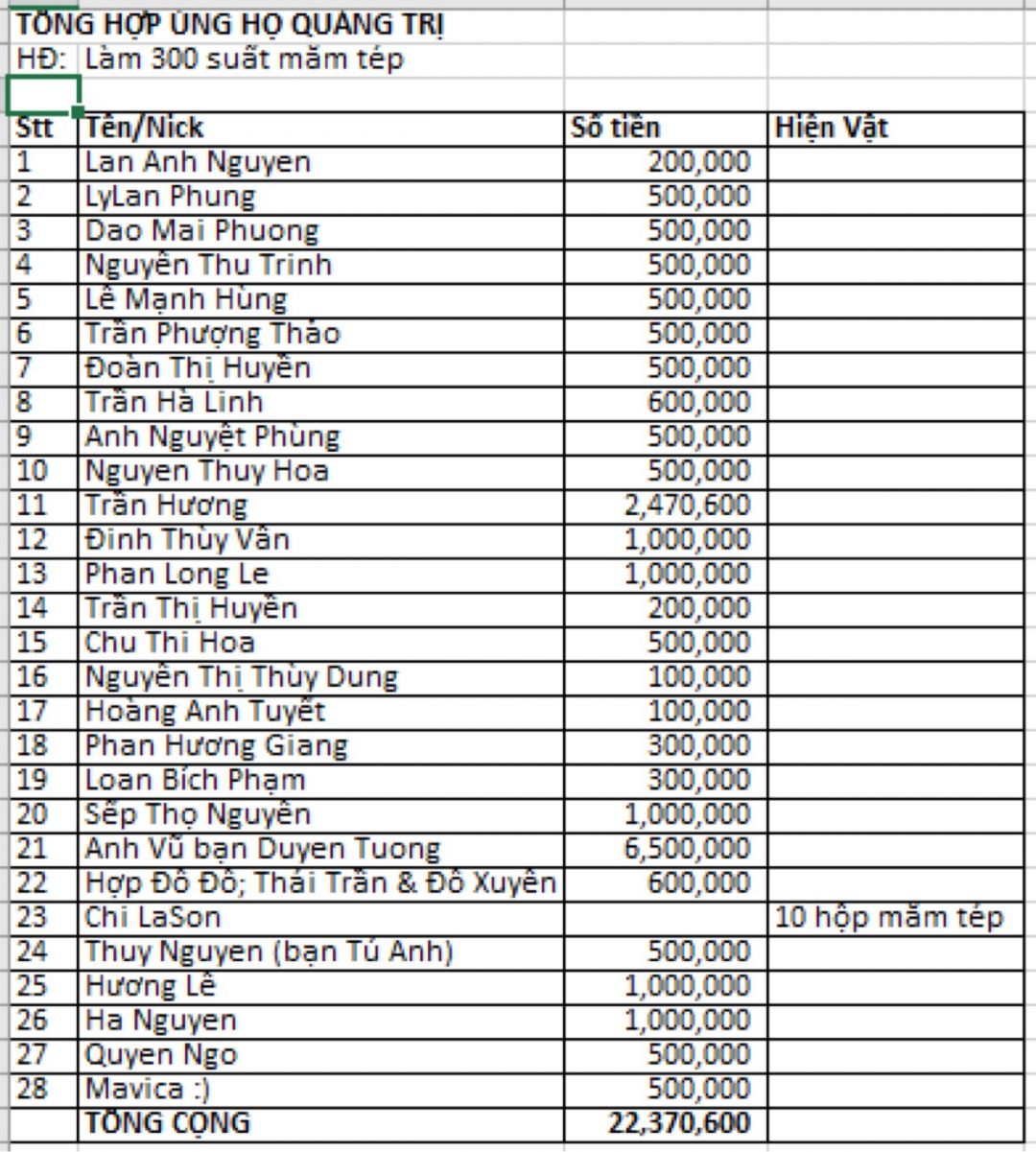 Tep xin được cập Nhật danh sách ủng hộ chương trình làm mắm tép ủng hộ Quảng Trị như file đính kèm ah. Theo đó tổng trị giá ủng hộ là 22.870.600đ trong đó có 1 khoản 500.000d Tep cập Nhật sót ah