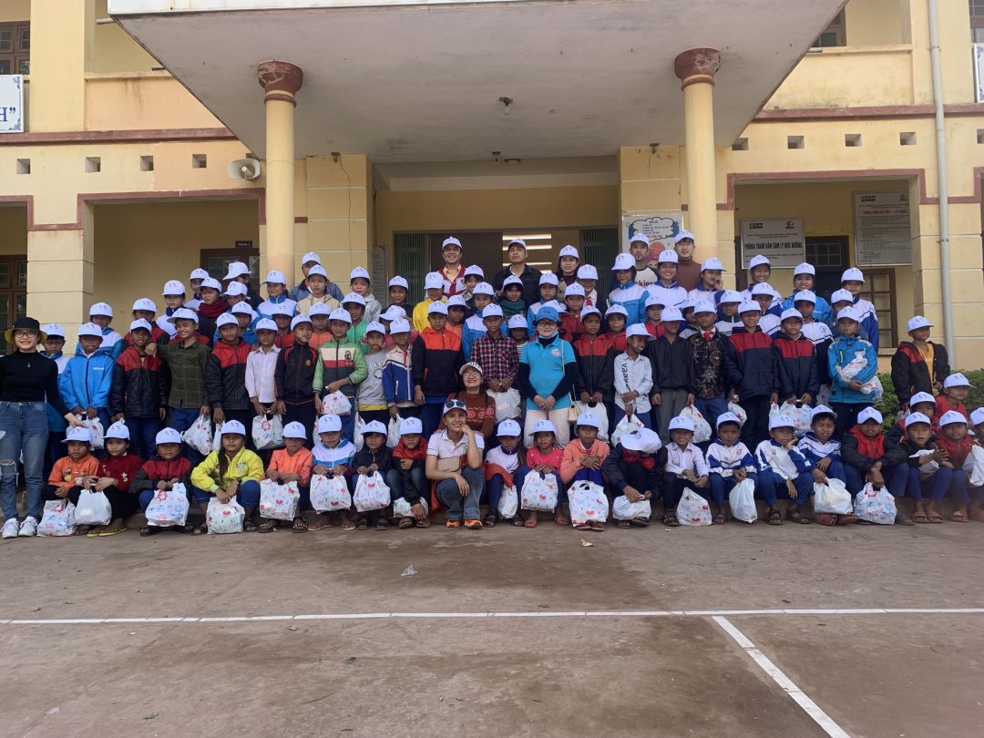 Nhóm 2: Trao quà cho 393 e học sinh trường THCS Thanh (1 cái áo mưa, 1 đôi dép, 1 bánh xà phòng lifebuoy, 1 cái mũ lưỡi trai) và áo quần cũ, vở, mũ len
