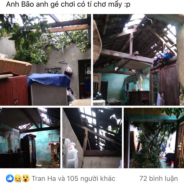Các phường e đang xin cũng là 2 phường vừa gánh chịu nặng nề cơn bão trước ngày đón lụt lịch sử hơn tuần thôi ạ! Xóm em nhà ngói và tồn điều Được nhảy múa trên bầu trời rất đẹp ạ!😢 Giờ ai có tiền thì thay mới, ai không tiền thì che tạm tấm lợp ạ!